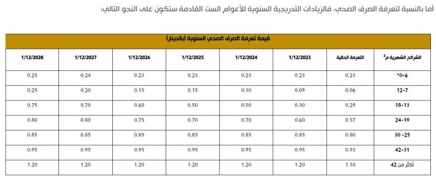 وسترتفع التعرفة المقطوعة للمياه، وفق المرحلة الثالثة ، للشريحة الأولى التي تستهلك 6 م3 فأقل شهرياً إلى 2.5 دينارا بزيادة 25 قرشا، فيما ستزيد التعرفة 5 قروش للمتر المكعب للشريحة الثانية التي تستهلك مياه بين 7 -12 م3، وسترتفع 10 قروش للشريحة الثالثة التي تستهلك مياه بين 13 - 18 م3، وستثبت عند 1.10 دينارا للشريحة الرابعة التي تستهلك مياه بين 19 - 24 م3، كما ستثبت عند 1.40 دينارا على الشريحة الخامسة التي تستهلك كميات بين 25 - 30 م3، وستثبت عند 1.80 دينارا على الشريحة السادسة التي تستهلك بين 31 – 42م3، وعند 2.20 دينارا على الشريحة السابعة التي يفوق استهلاكها الشهري 42 م3.