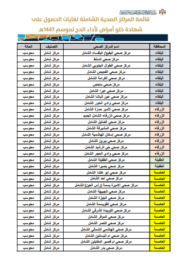 المراكز الصحية المعتمدة لاستلام تصاريح الحج - أسماء