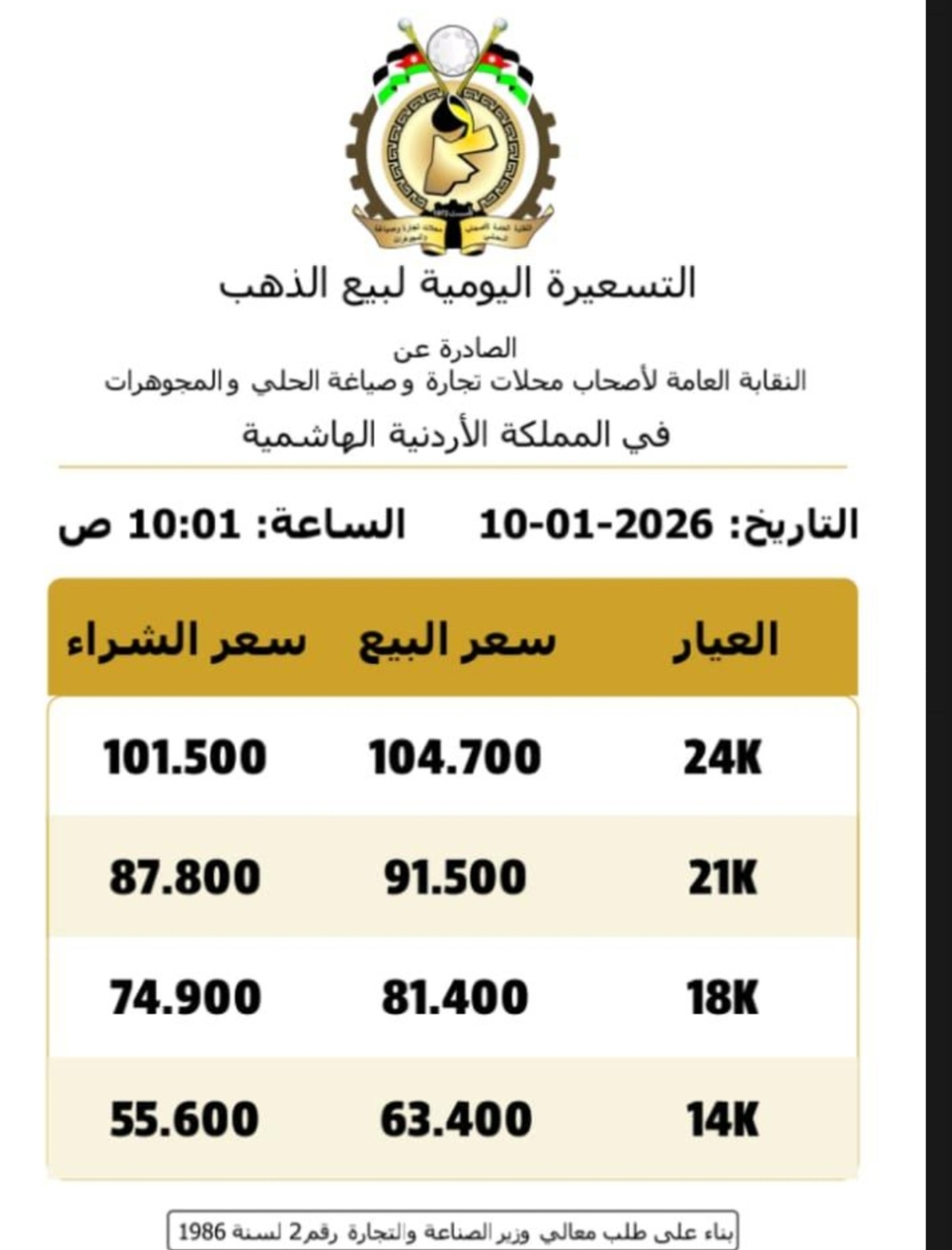 أصدرت النقابة العامة لأصحاب محلات تجارة وصياغة الحلي والمجوهرات في المملكة الأردنية الهاشمية، اليوم السبت، التسعيرة اليومية لبيع وشراء الذهب، والتي أظهرت ارتفاعًا على أسعار المعدن الأصفر في السوق المحلي.