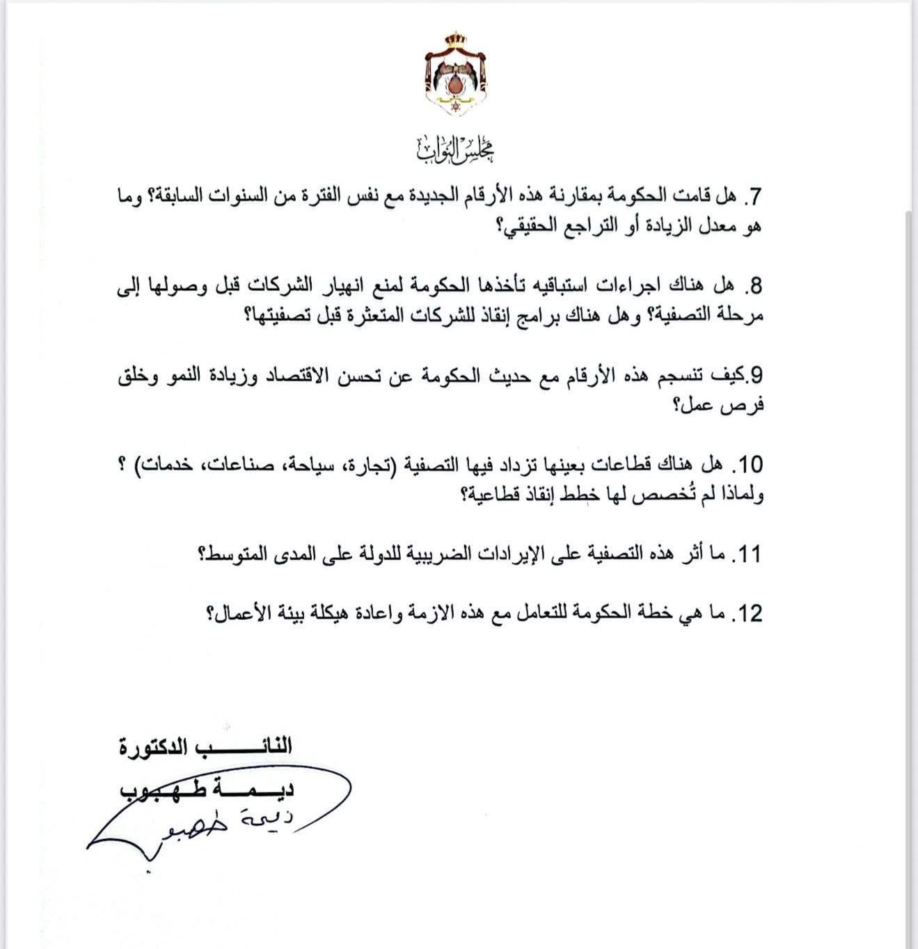 وجّهت النائب الدكتورة ديمة طهبوب سؤالًا نيابيًا إلى الحكومة، استنادًا لأحكام المادة 96 من الدستور وعملًا بأحكام المادة 123 من النظام الداخلي لمجلس النواب، اليوم الأحد، بشأن الارتفاع الكبير في طلبات تصفية وشطب الشركات في الأردن خلال عام 2025.