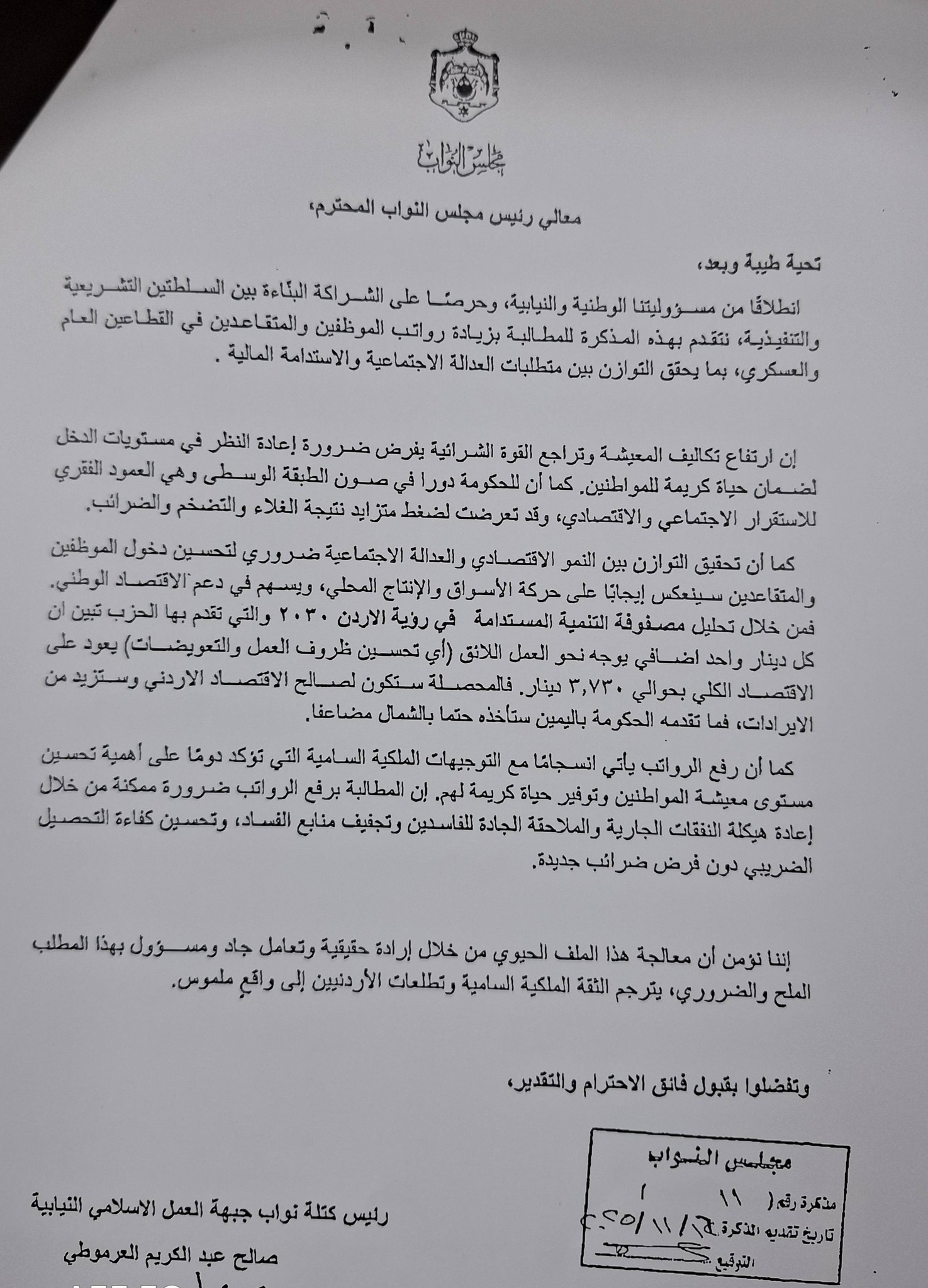 ودعا العرموطي في مذكرة حصلت " جفرا نيوز " على نسخة منها، بزيادة رواتب الموظفين والمتقاعدين في القطاعين العام والعسكري، بما يحقق التوازن بين متطلبات العدالة الاجتماعية ، والاستدامة المالية، خاصة مع ارتفاع تكاليف المعيشة وتراجع القوة الشرائية.