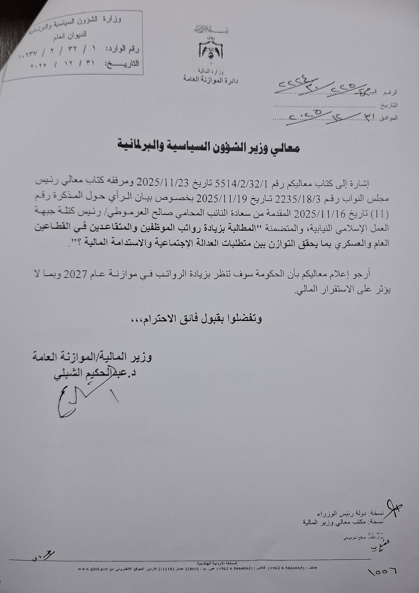 جفرا نيوز - تعهدت الحكومة ردًا على مذكرة رئيس كتلة جبهة العمل الإسلامي النيابية صالح العرموطي، بالنظر بملف زيادة الرواتب في مشروع قانون الموازنة العامة للسنة المالية 2027 ، بما لا يؤثر على الاستقرار المالي.