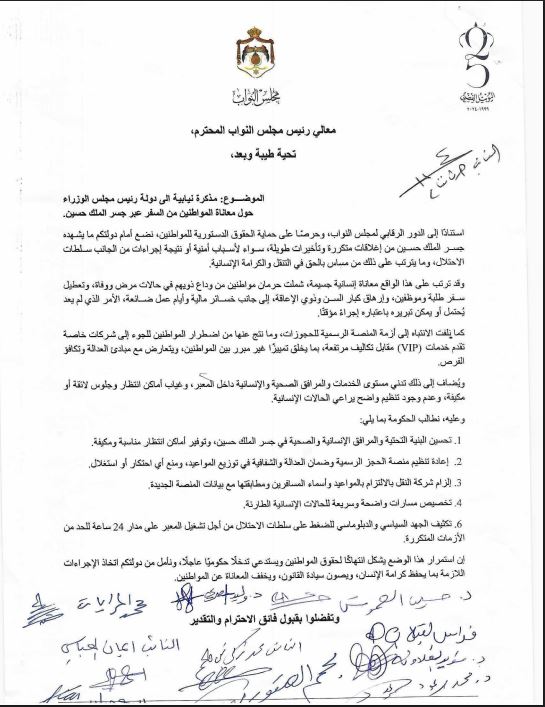 وطالب النواب في المذكرة التي حصلت "جفرا نيوز" على نسخة منها، الحكومة بالعمل على تحسين البنية التحتية، والمرافق الإنسانية والصحية في جسر الملك حسين، وإعادة تنظيم منصة الحجز، وضمان العدالة والشفافية في توزيع المواعيد، وإلزام شركة النقل بالالتزام بالمواعيد ، وأسماء المسافرين ومطابقتها مع بيانات المنصة الجديدة، وتخصيص مسارات واضحة، وسريعة للحالات الإنسانية الطارئة.
