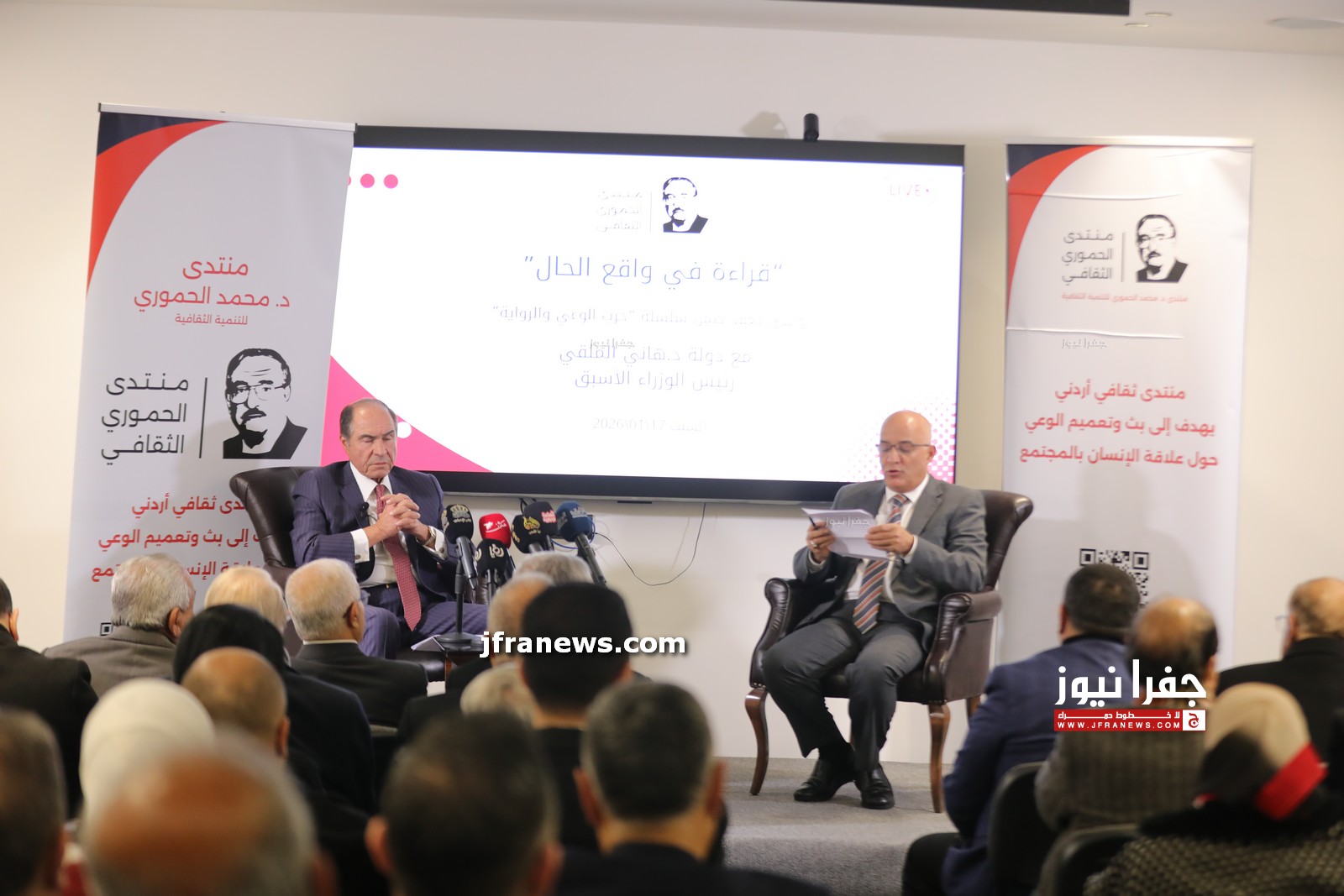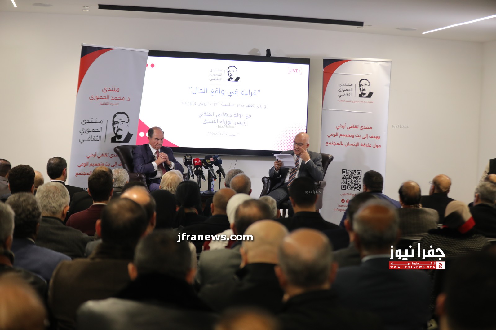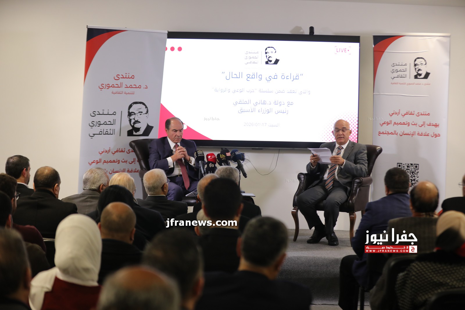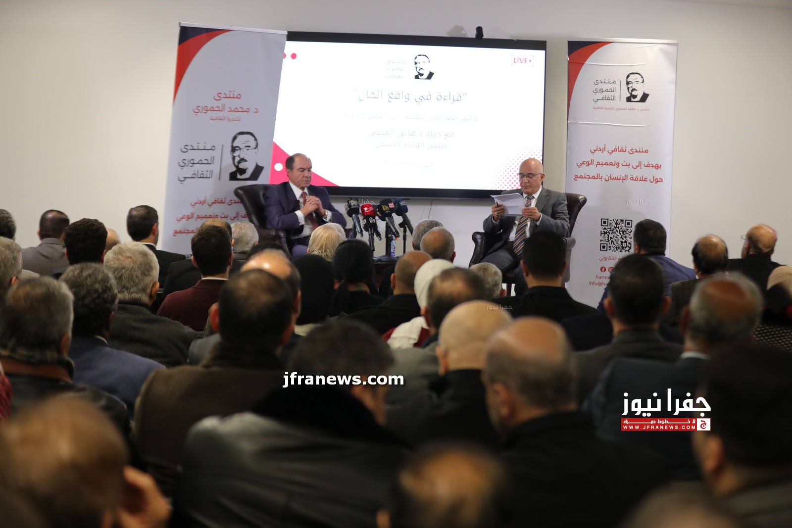 عقد منتدى الدكتور محمد الحموري للتنمية الثقافية حوارية فكرية بعنوان "قراءة في واقع الحال"، ضمن سلسلة فعالياته "حرب الوعي والرواية"، بمشاركة هاني الملقي، رئيس الوزراء الأسبق، وبحضور نخبة من المثقفين والباحثين والمهتمين بالشأنين الأردني والإقليمي، فيما أدار الحوار مهند مبيضين، وزير الاتصال الحكومي الأسبق.