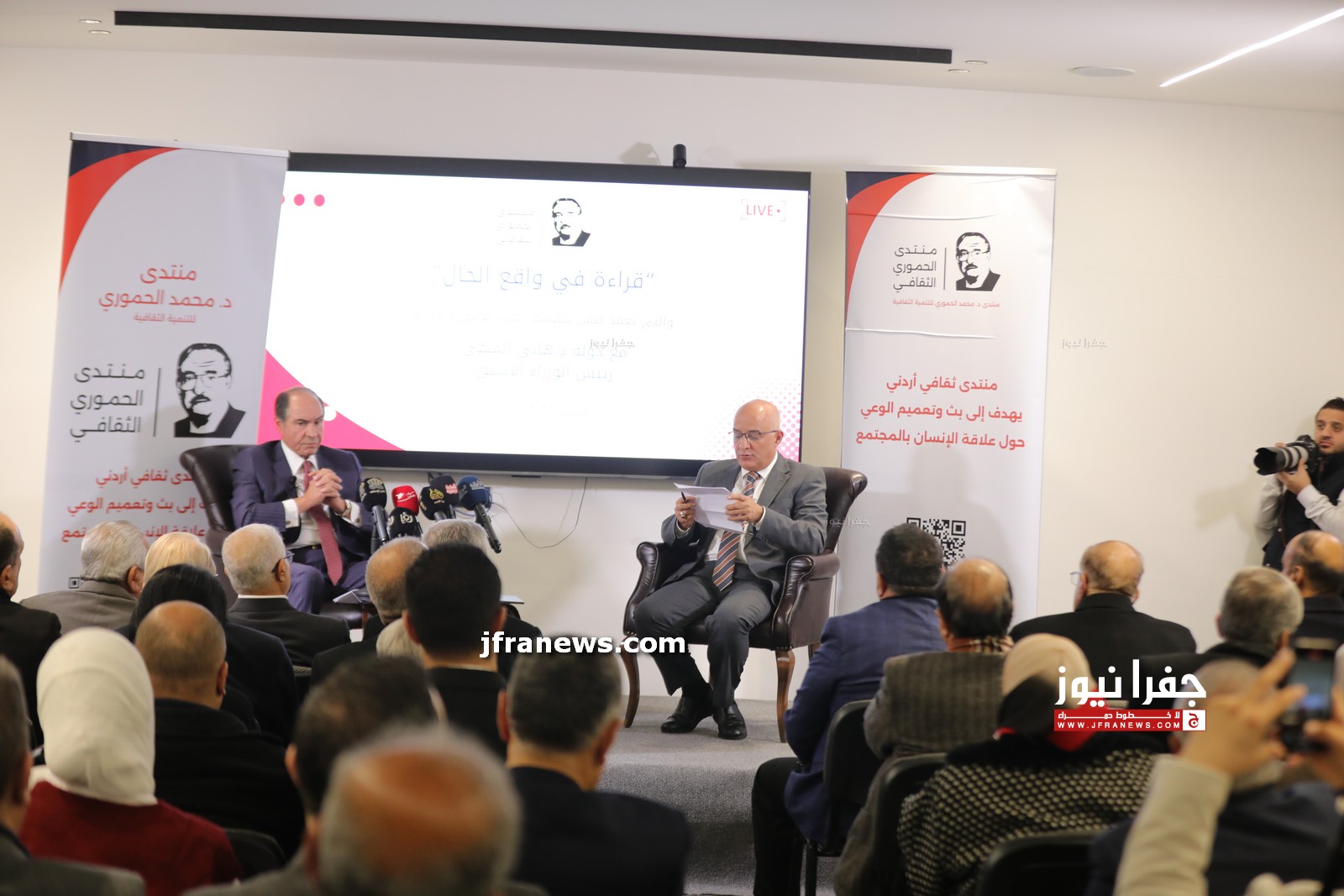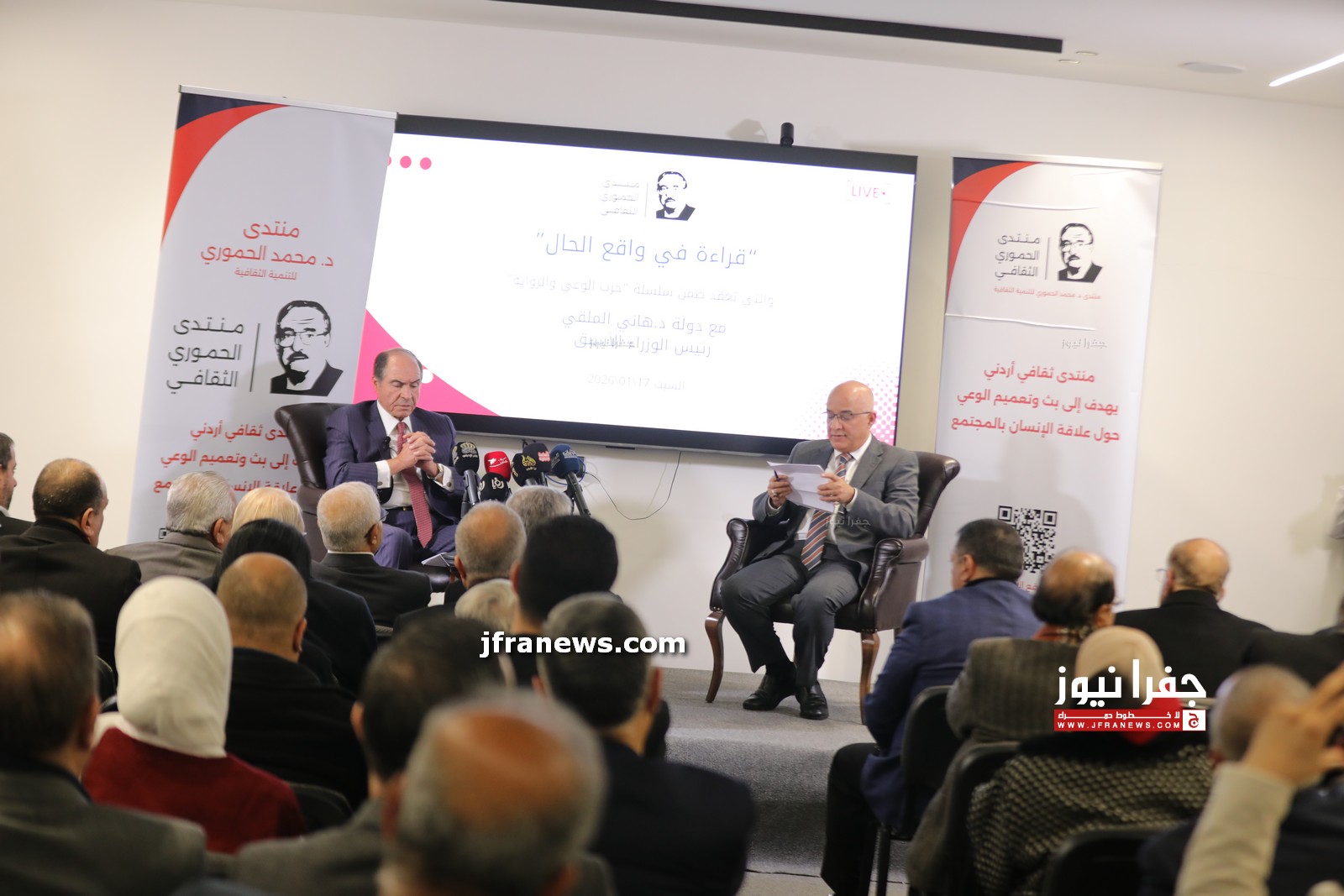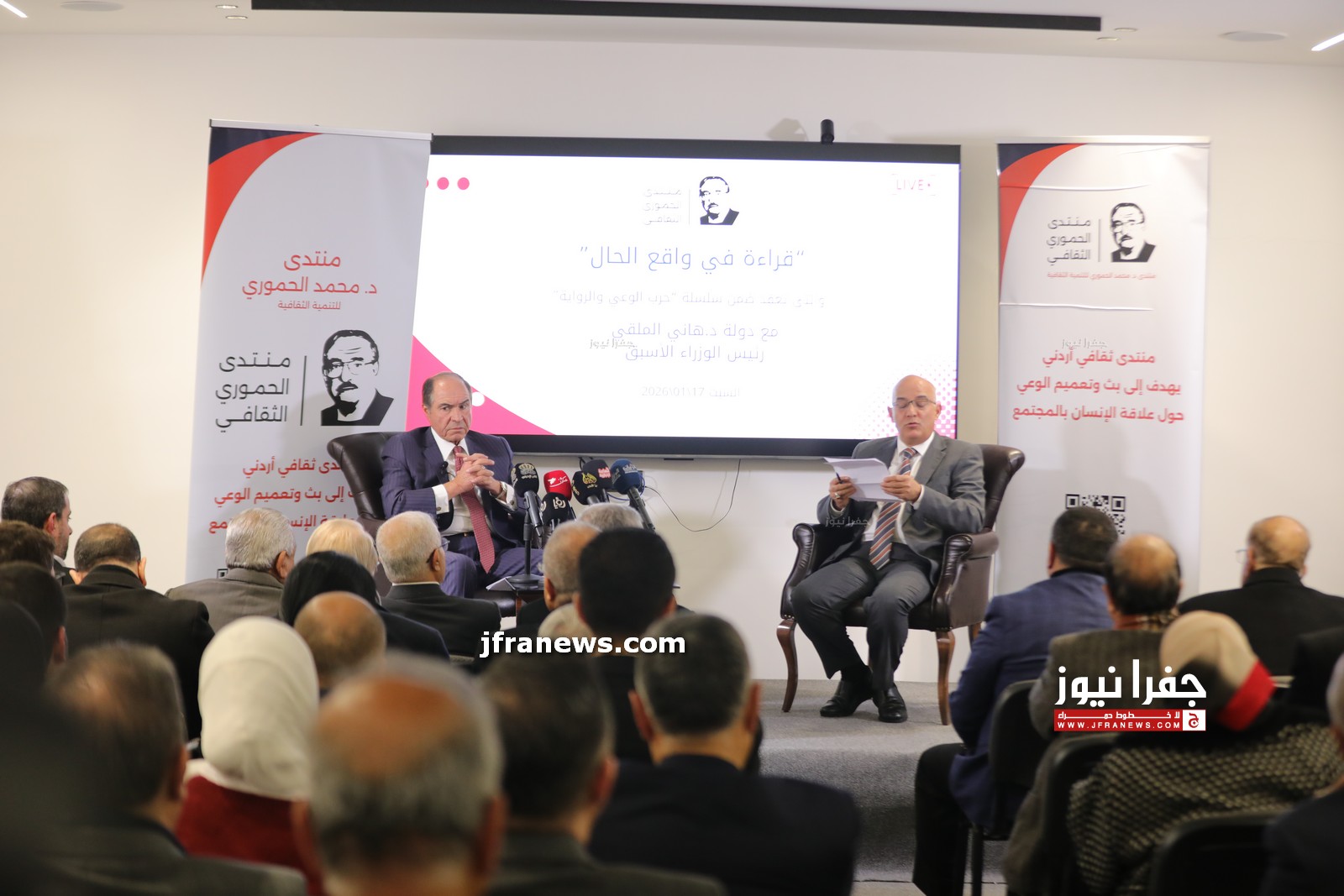 عقد منتدى الدكتور محمد الحموري للتنمية الثقافية حوارية فكرية بعنوان "قراءة في واقع الحال"، ضمن سلسلة فعالياته "حرب الوعي والرواية"، بمشاركة هاني الملقي، رئيس الوزراء الأسبق، وبحضور نخبة من المثقفين والباحثين والمهتمين بالشأنين الأردني والإقليمي، فيما أدار الحوار مهند مبيضين، وزير الاتصال الحكومي الأسبق.