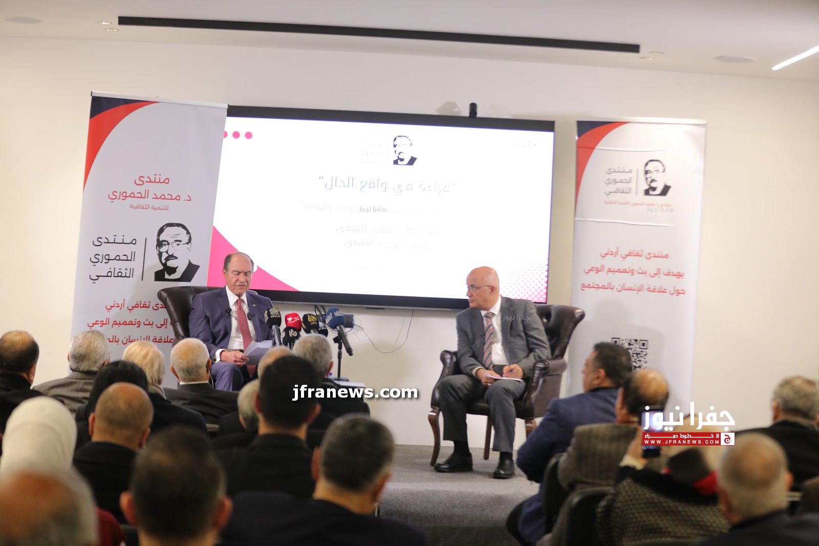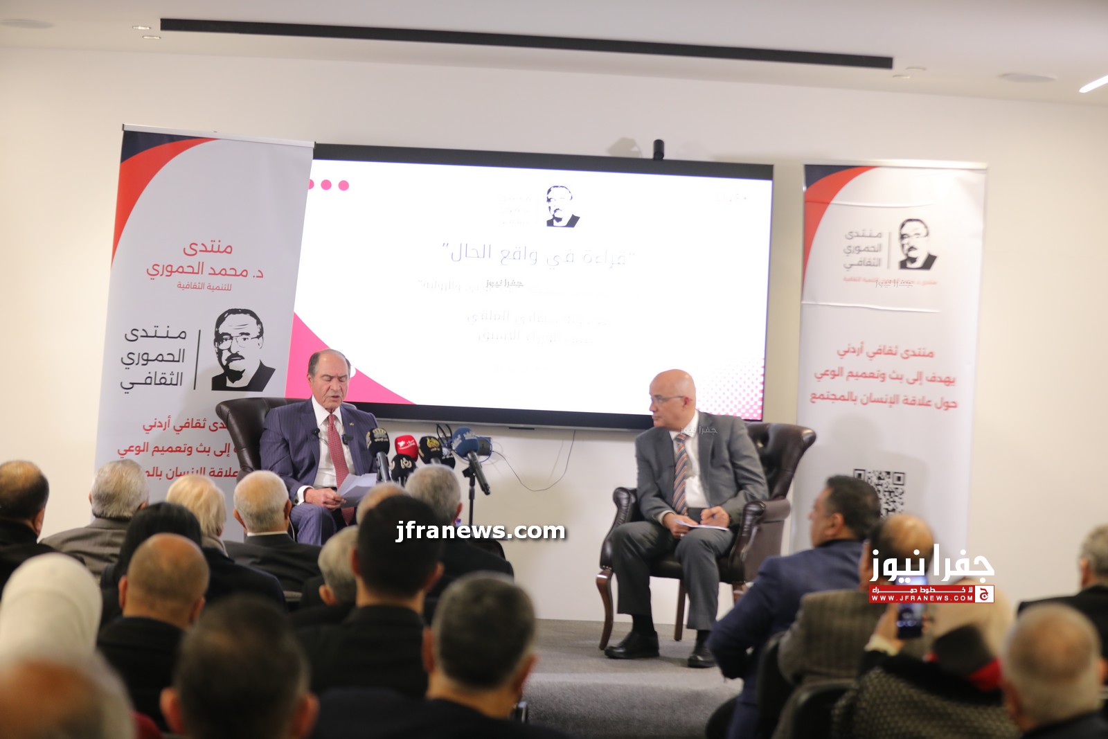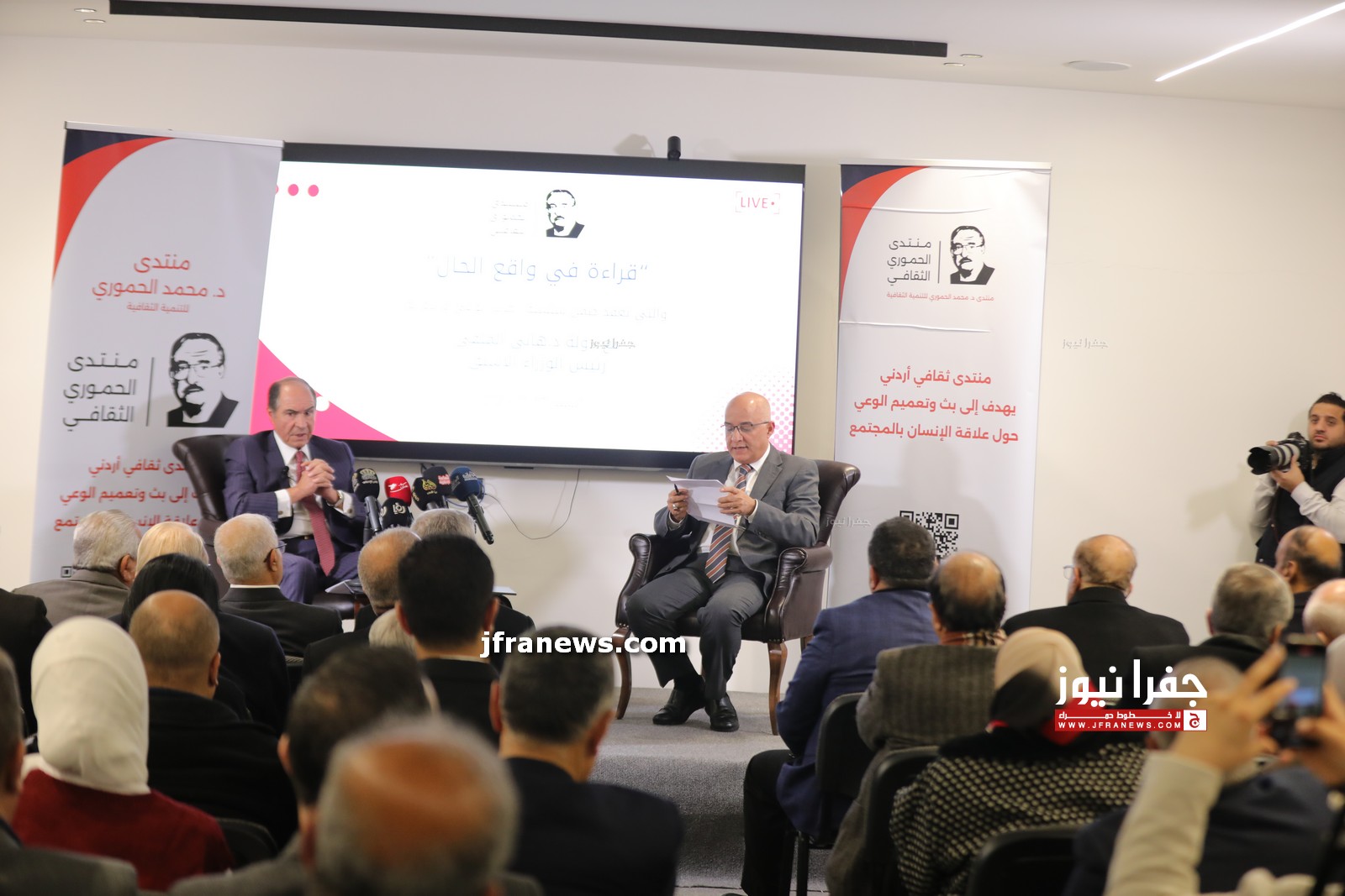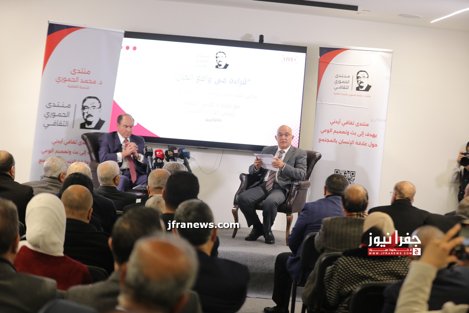 عقد منتدى الدكتور محمد الحموري للتنمية الثقافية حوارية فكرية بعنوان "قراءة في واقع الحال"، ضمن سلسلة فعالياته "حرب الوعي والرواية"، بمشاركة هاني الملقي، رئيس الوزراء الأسبق، وبحضور نخبة من المثقفين والباحثين والمهتمين بالشأنين الأردني والإقليمي، فيما أدار الحوار مهند مبيضين، وزير الاتصال الحكومي الأسبق.