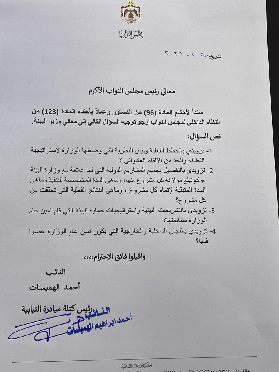وجه النائب احمد هميسات اسئلة نيابية إلى وزير البيئة حول خطط الوزارة المستقبلية للحد من الإلقاء العشوائي للنفايات.
