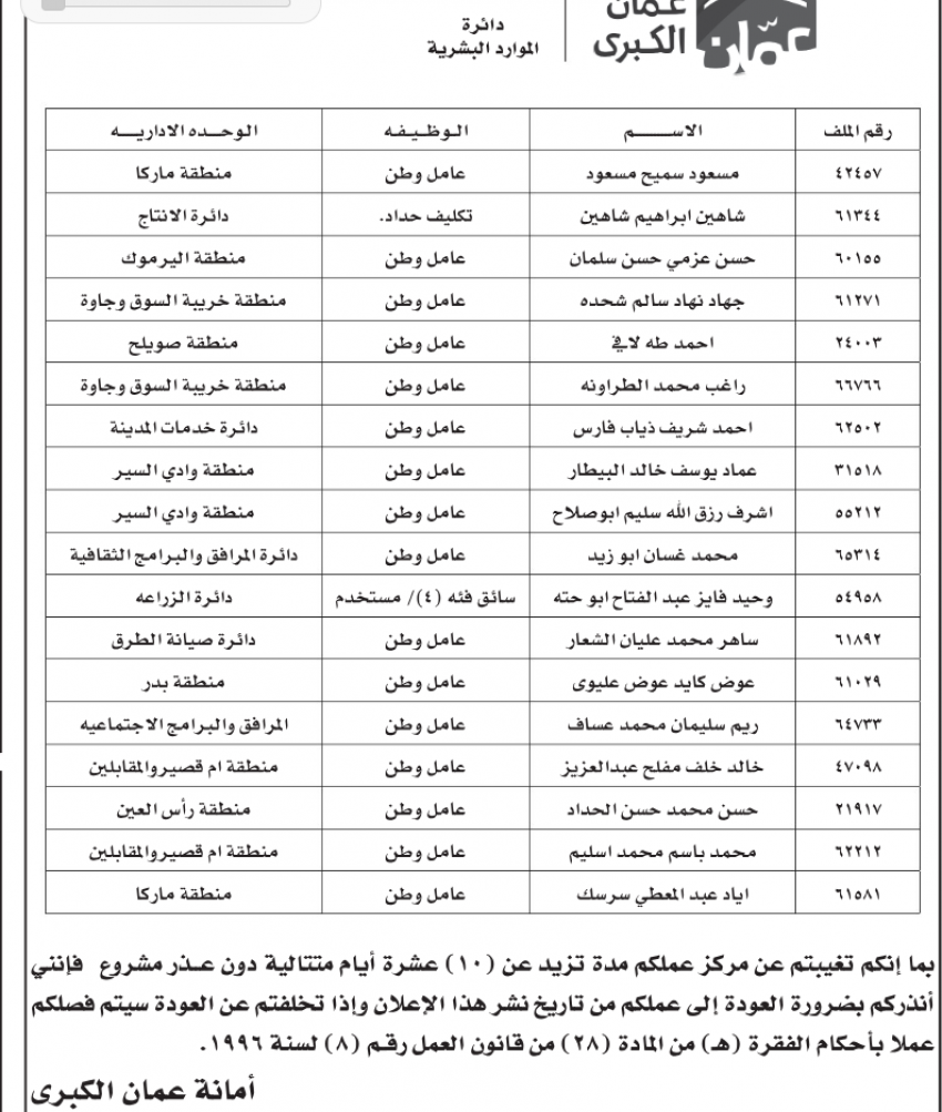 أنذرت أمانة عمان الكبرى عدد من الموظفين لديها بالعودة إلى العمل بعد تغيبهم بدون عذر رسمي لفترة تجاوزت الحدود القانونية.