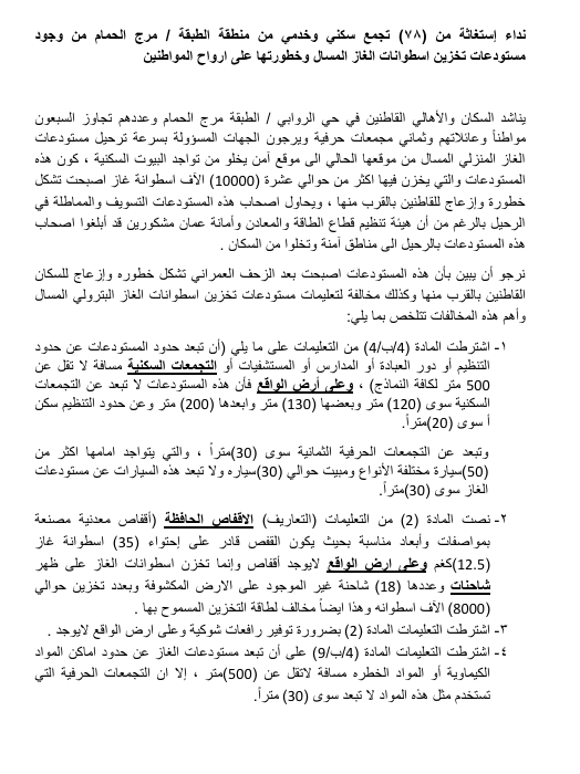 جفرا نيوز - وجه 78 مواطنًا في تجمعات سكنية وخدمية، من سكان منطقة الطبقة في مرج الحمام نداء استغاثة إلى الحكومة، بضرورة ترحيل مستودعات الغاز المنزلي المسال من موقعها الحالي إلى موقع آمن يخلو من تواجد البيوت السكنية؛ نظرًا لخطورتها على أرواح المواطنين.