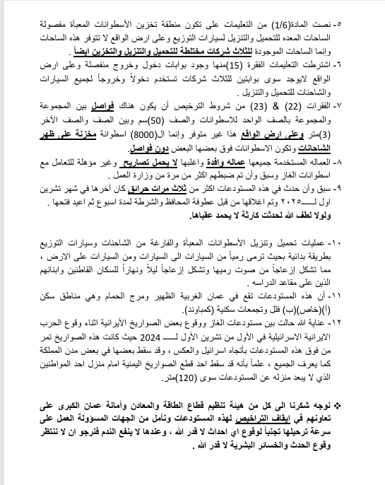 وبحسب النص الذي وصل "جفرا نيوز"، فإن هنالك مخالفات لتعليمات مستودعات تخزين الغاز البترولي المسال.