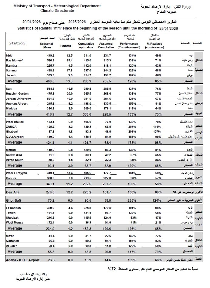 كشفت دائرة الأرصاد الجوية عن كميات الامطار التي هطلت على المملكة خلال الفترة الماضية.