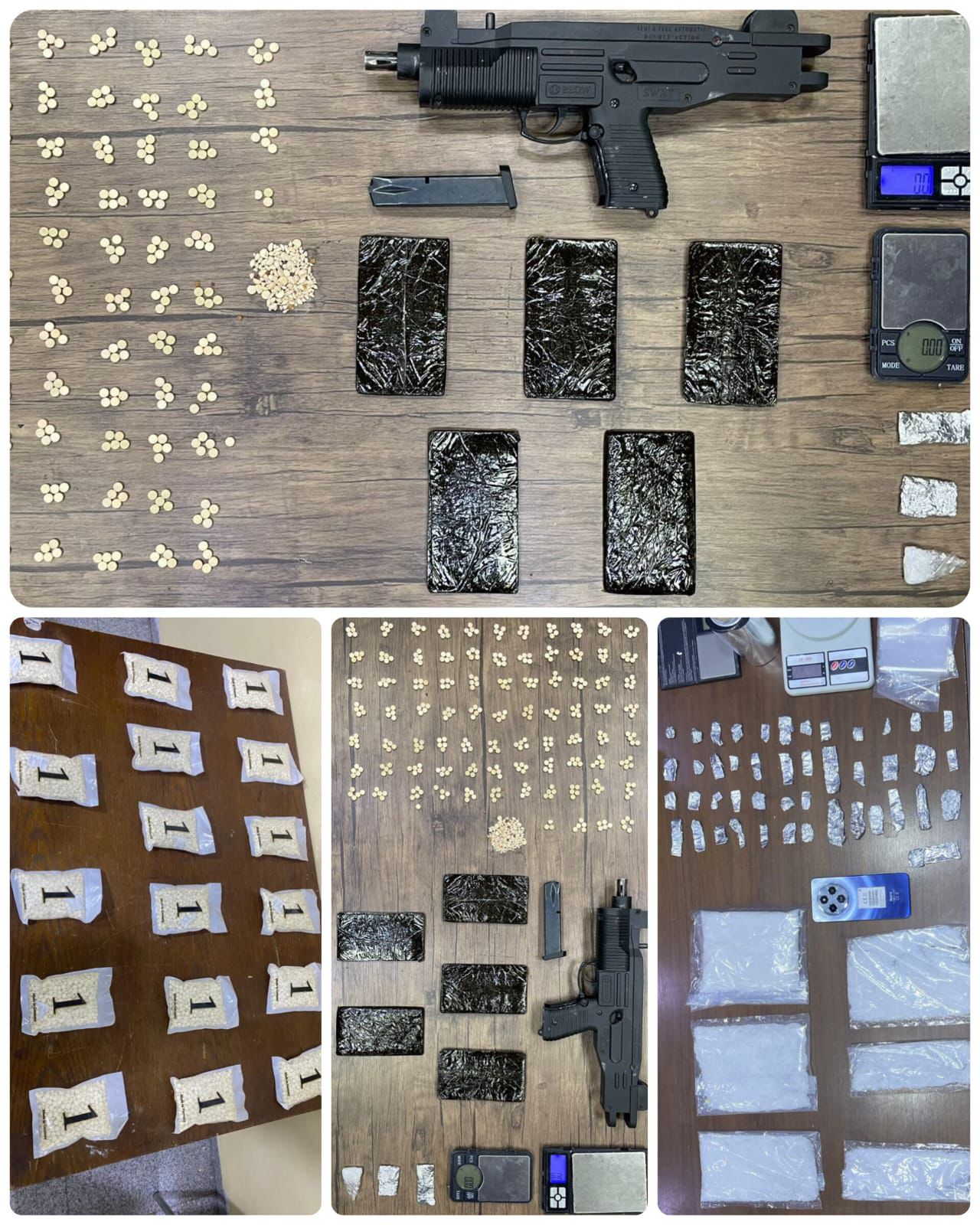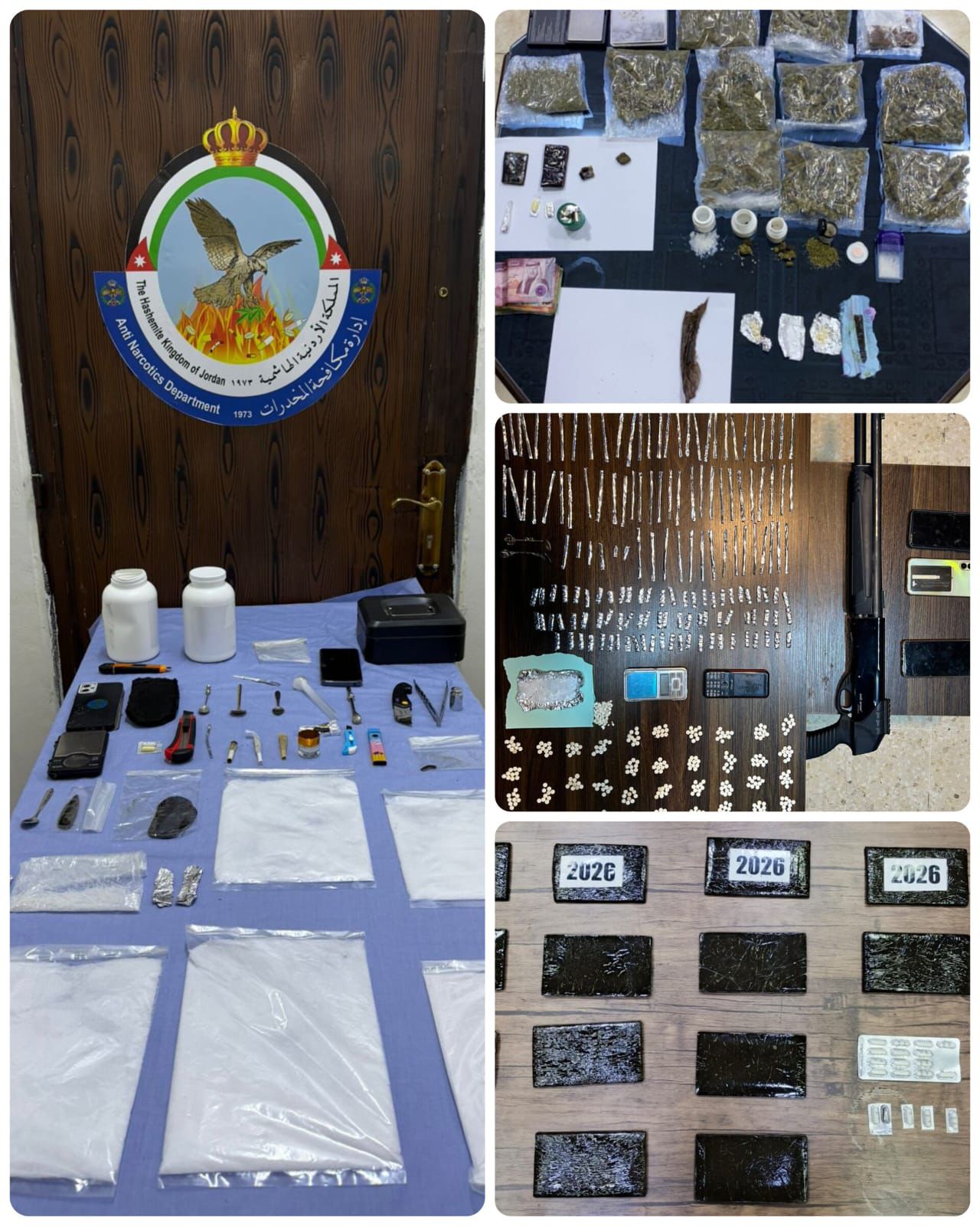 وفي لواء الرمثا وبعد جمع المعلومات حول تاجر خطر للمخدرات ممن يوزعون مادة الكريستال القاتلة، حيث جرى تحديد مكانه وحيازته لكمية من تلك المادة وجرت مداهمته وإلقاء القبض عليه وضبط بحوزته 1.5 كغم منها، فيما أُلقي القبض في المفرق على 3 أشخاص من مروجي المخدرات وبحوزتهم 4 آلاف حبة مخدرة بعد متابعتهم ومداهمتهم .