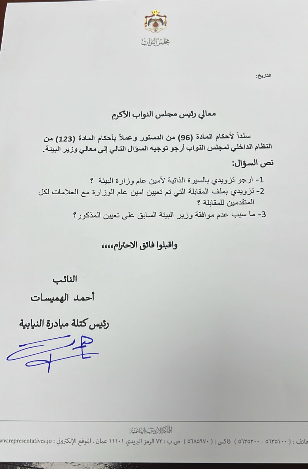 وجه النائب أحمد هميسات، اليوم الثلاثاء، سؤالًا إلى وزير البيئة، استنادًا لأحكام المادة 96 من الدستور وعملًا بأحكام المادة 123 من النظام الداخلي لمجلس النواب، حول السيرة الذاتية لأمين عام الوزارة.