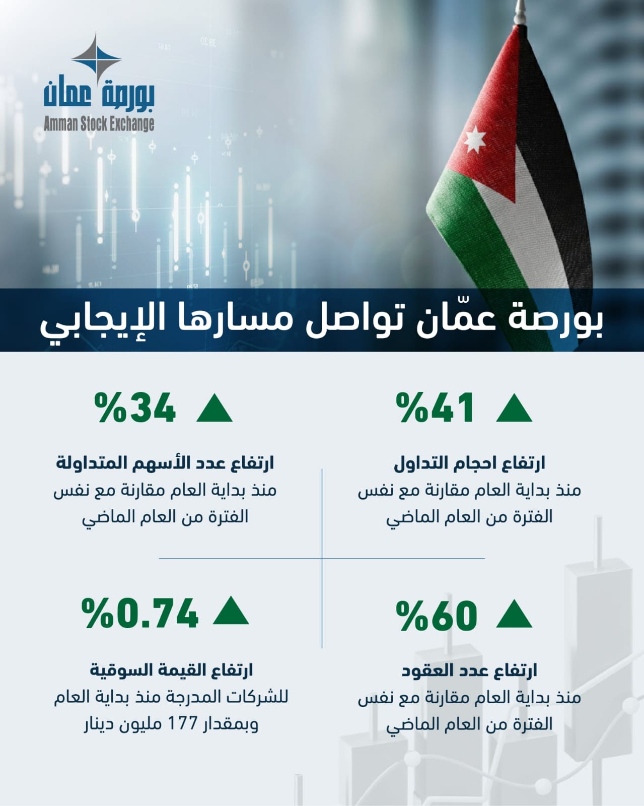 ومع تواصل المسار الإيجابي لبورصة عمّان، فإن عدد الأسهم المتداولة منذ بداية العام، بلغ 34%، مع نفس الفترة من العام الماضي.