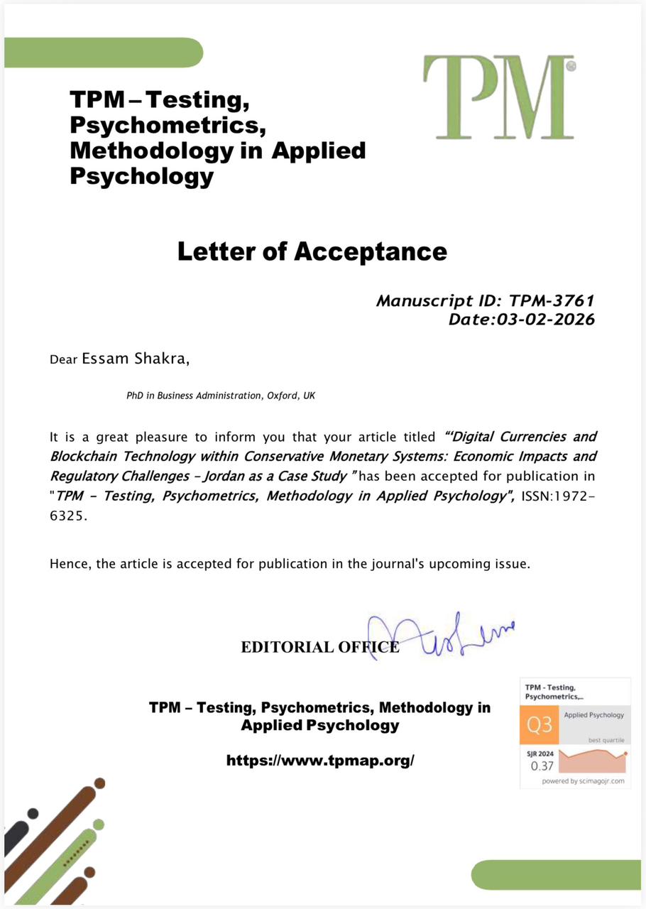 أعلنت هيئة تحرير مجلة TPM – Testing, Psychometrics, Methodology in Applied Psychology، وهي مجلة علمية دولية مُحكّمة ومُفهرسة رسميًا ضمن قاعدة Scopus العالمية، عن قبول بحث علمي للدكتور عصام شقرة، رجل الأعمال والباحث في الشؤون الاقتصادية، وذلك تمهيدًا لنشره في أحد أعداد المجلة القادمة.