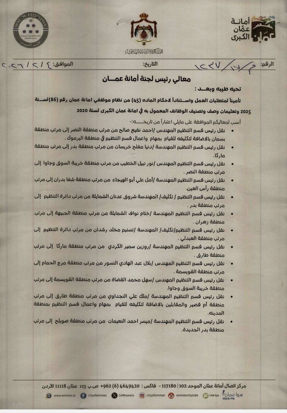 جاء ذلك تأمينا لمتطلبات العمل واستنادا لاحكام المادة 45 من نظام موظفي أمانة عمان رقم 86 لسنة 2025 وتعليمات وصف وتصنيف الوظائف المعمول به في أمانة عمان الكبرى لسنة 2020.