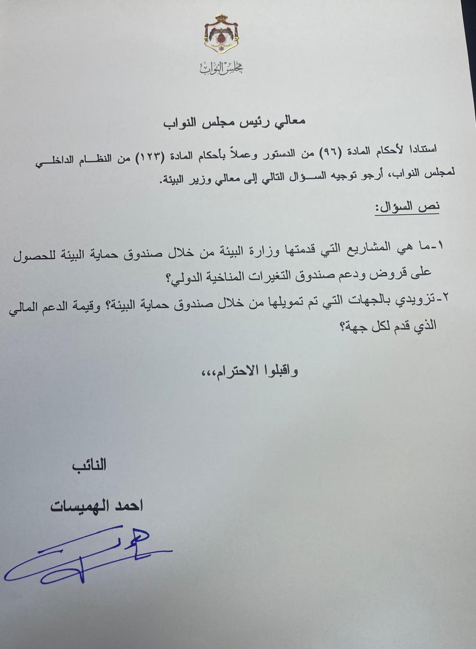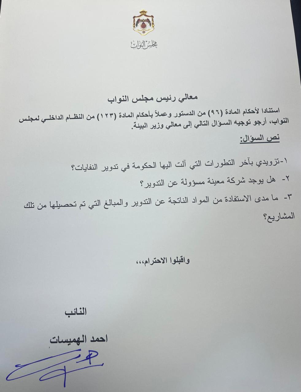وجه النائب أحمد الهميسات عدة اسئلة نيابية إلى وزير البيئة طالبًا منه الكشف عن آلية تدوير النفايات وعن وجود شركة مختصة لهذه الغاية؟، والطرق التعامل مع النفايات الخطرة؟.