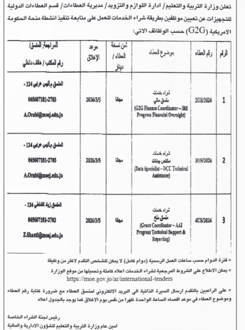 أعلنت وزارة التربية والتعليم عن رغبتها في شراء دمات موظفين لشغل موقع شاغرة في وظائف مختلفة.