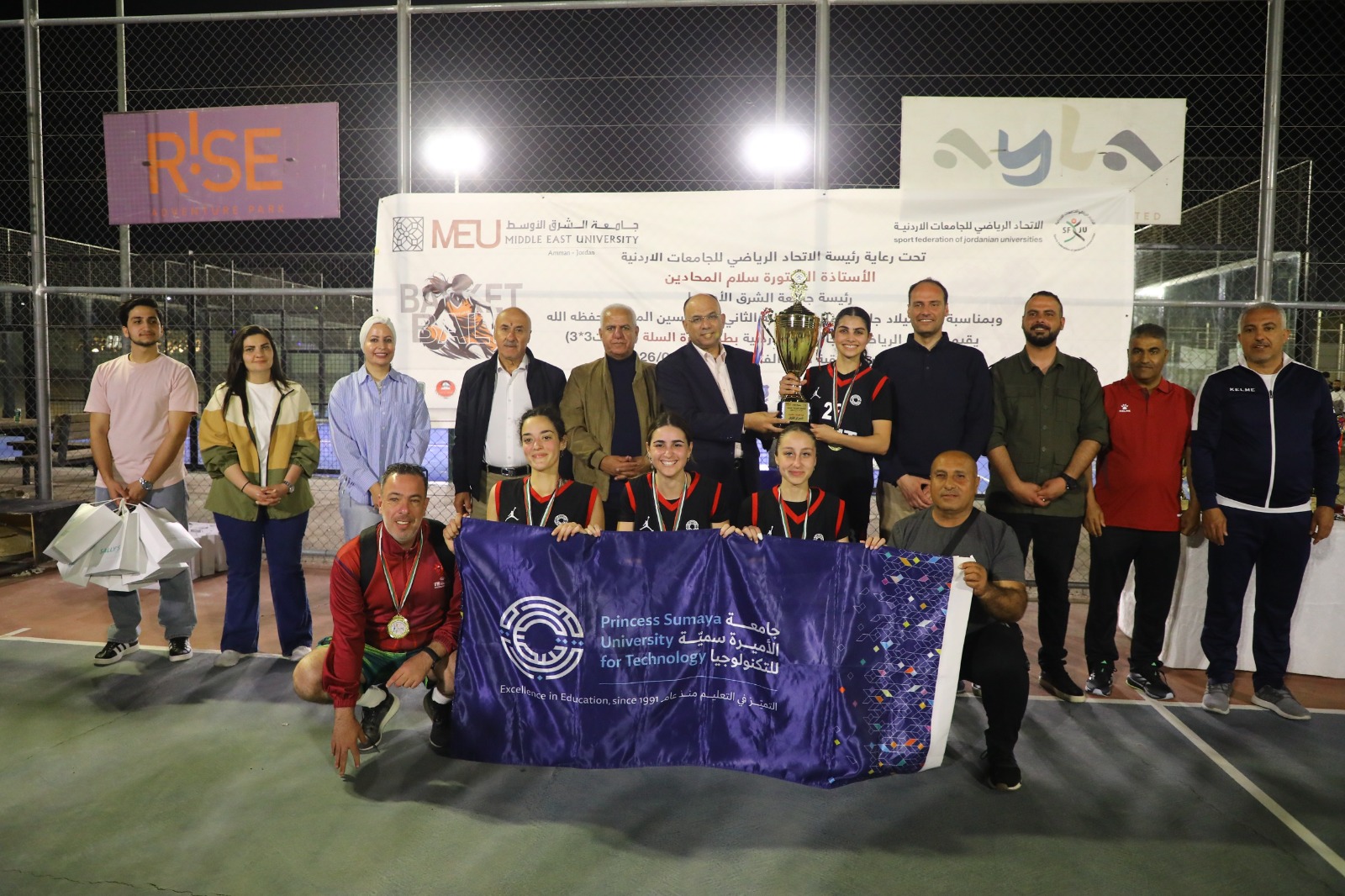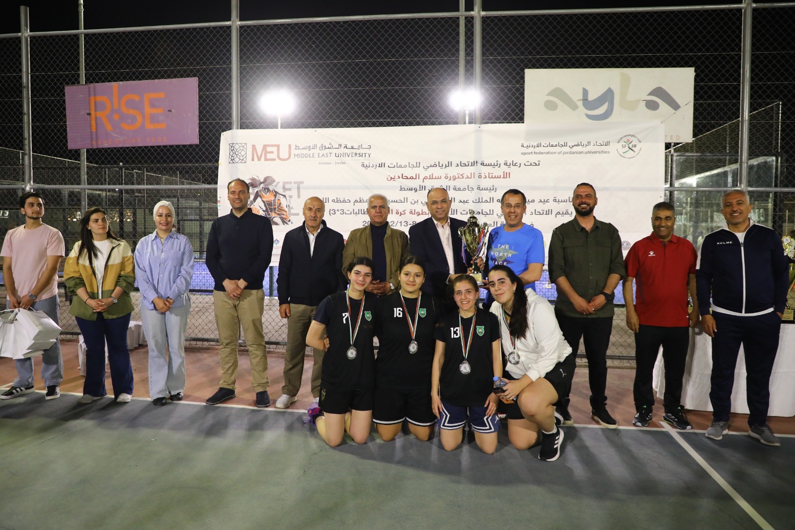 حيث قام أمين سر الاتحاد الرياضي للجامعات الأردنية، عميد شؤون الطلبة في جامعة الشرق الأوسط، الدكتور حازم النسور، بتسليم الكؤوس والميداليات للفرق الحاصلة على المراكز الثلاثة الأولى، مشيدًا بالمستوى الفني الذي أظهرته الفرق المشاركة.