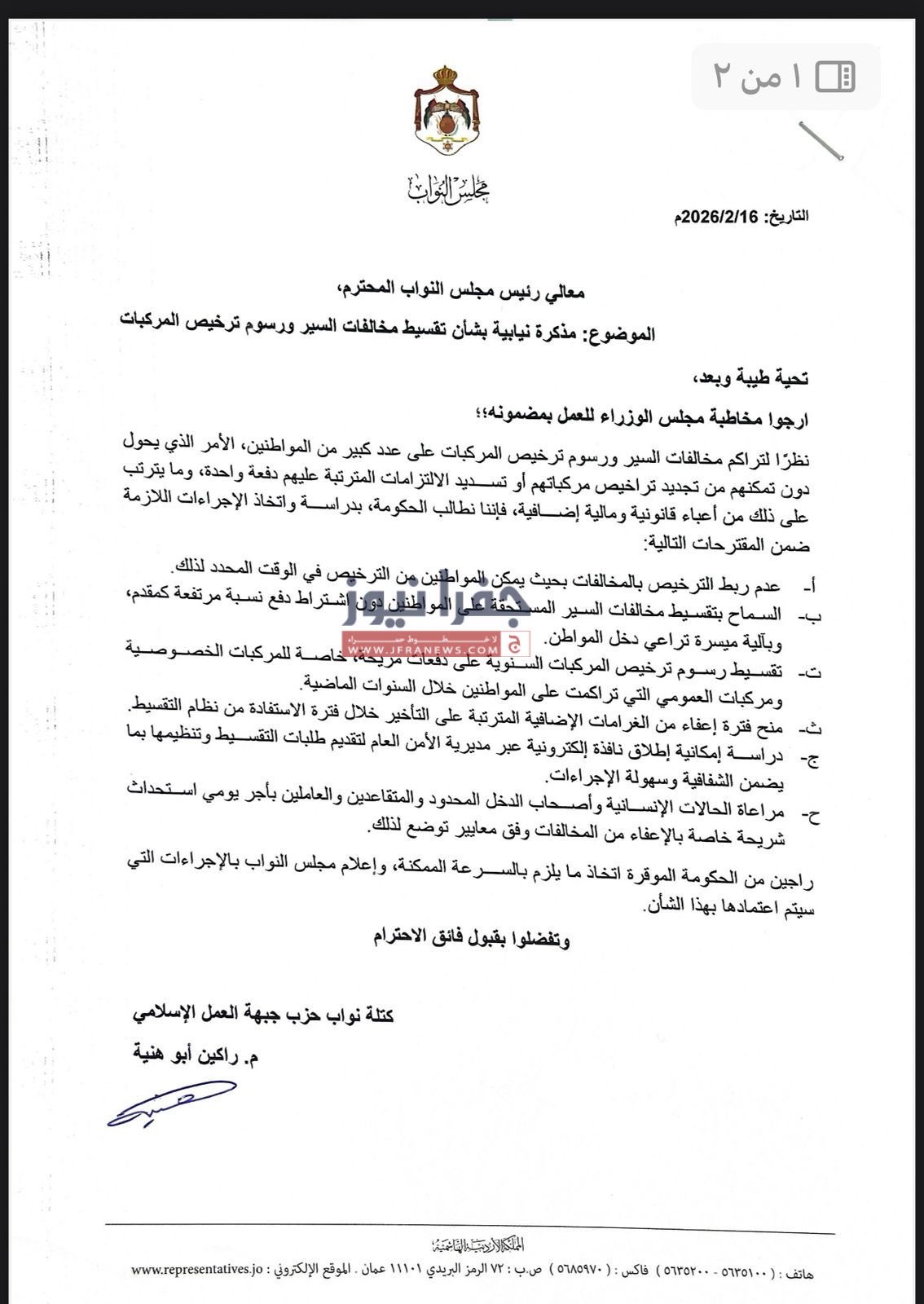 دعا نواب مجلس الوزراء من خلال مذكرة حصلت "جفرا نيوز" على نسخة منها، إلى عدم ربط ترخيص المركبات بمخالفات السير، سيما مع تراكمها على المواطنين.