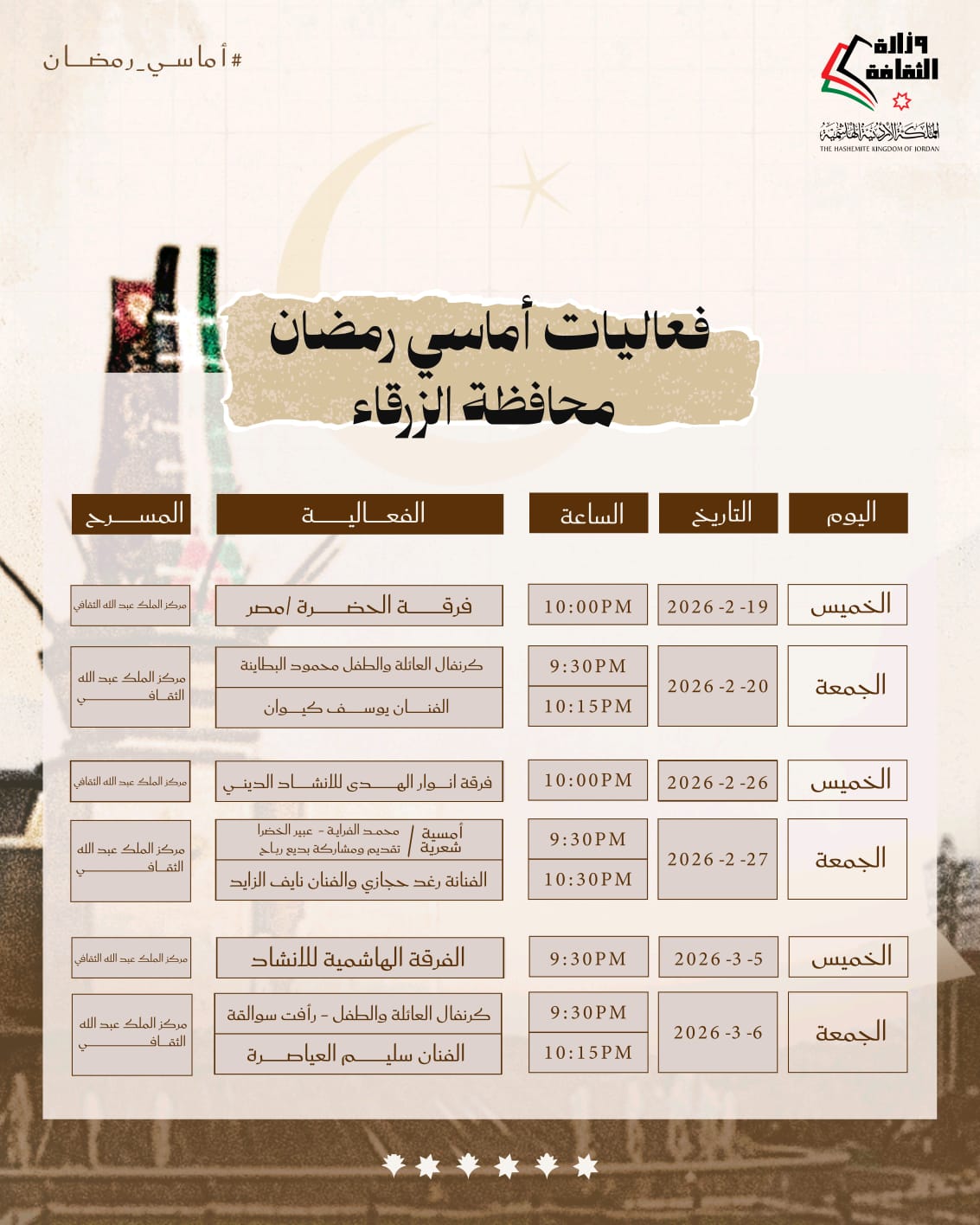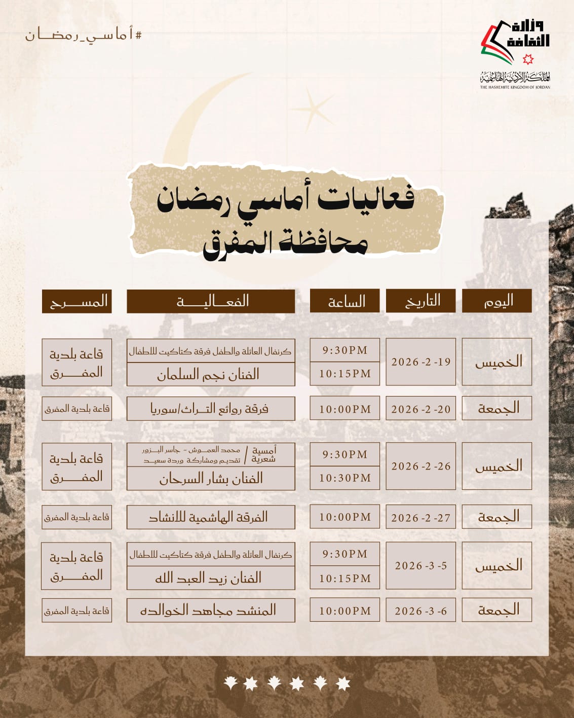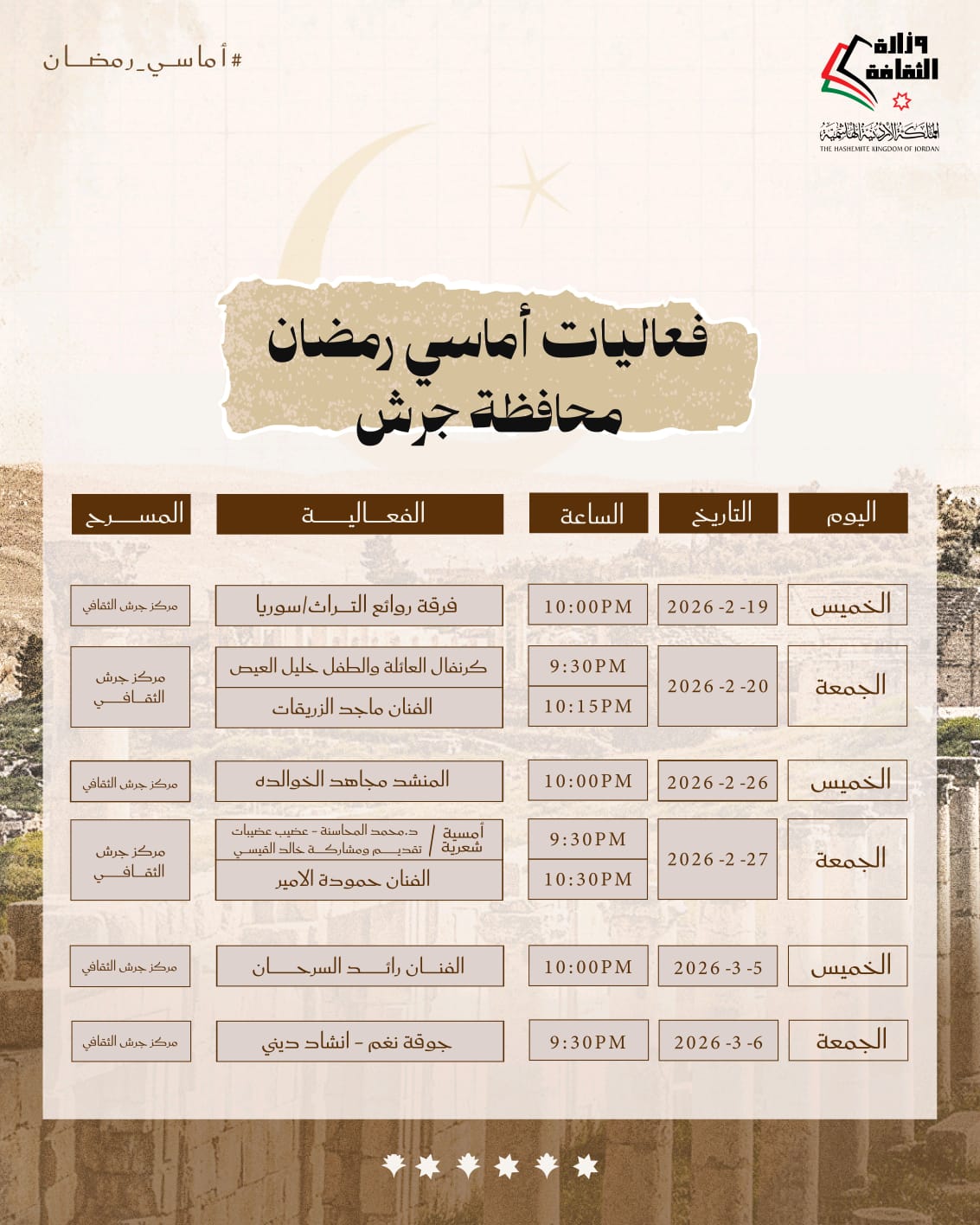 أعلنت وزارة الثقافة وبالتعاون مع إدارة مهرجان جرش اقامة فعاليات أماسي رمضان يومي الخميس والجمعة طيلة الشهر الفضيل.