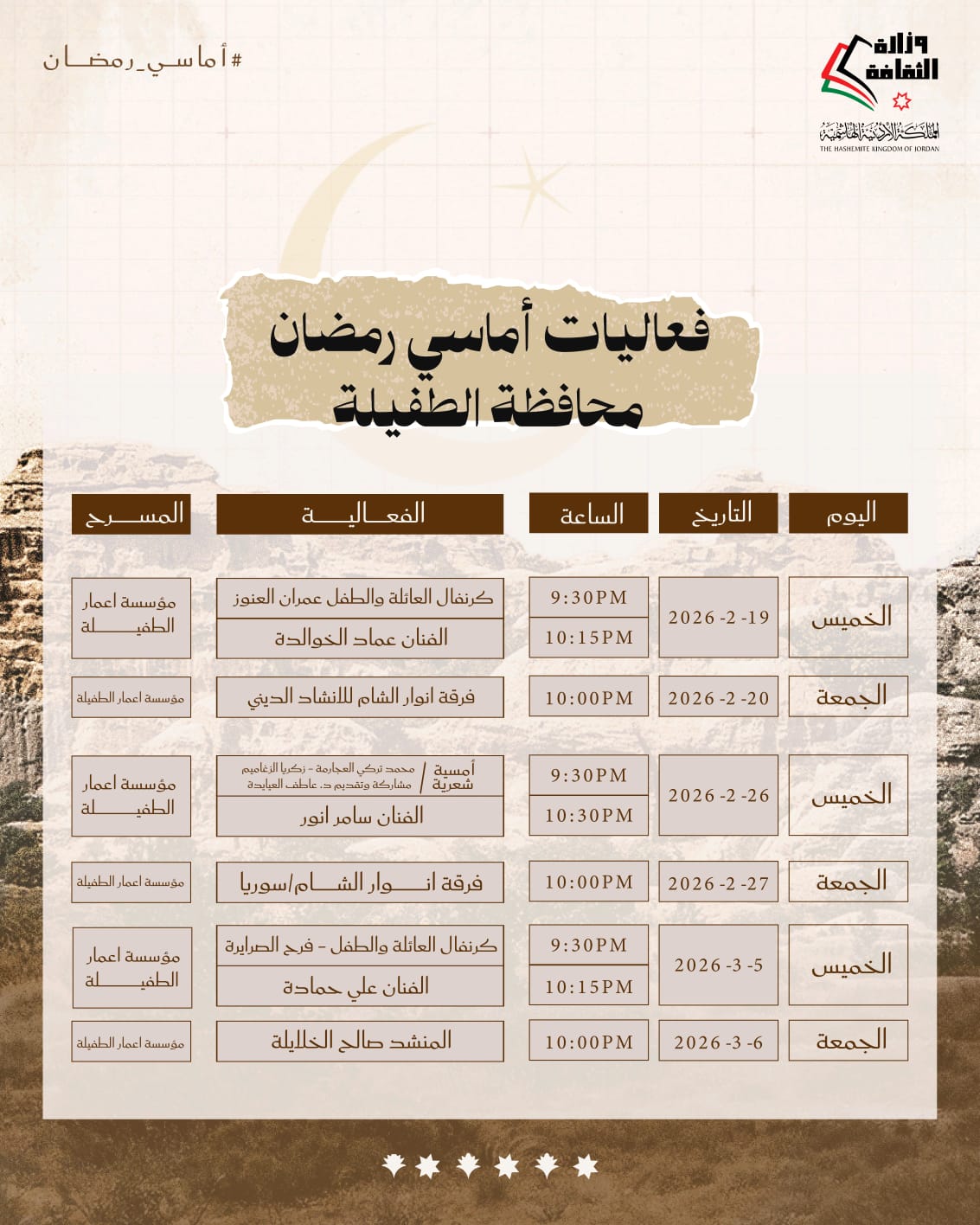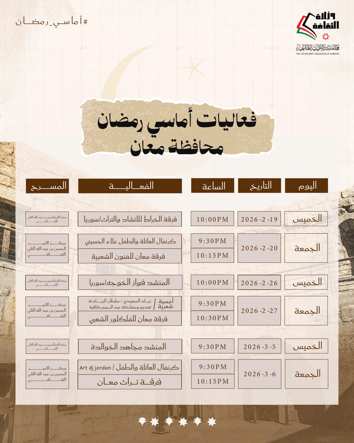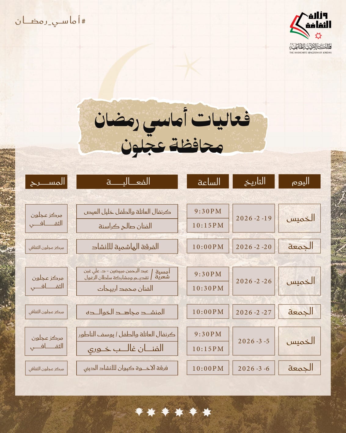 أعلنت وزارة الثقافة وبالتعاون مع إدارة مهرجان جرش اقامة فعاليات أماسي رمضان يومي الخميس والجمعة طيلة الشهر الفضيل.