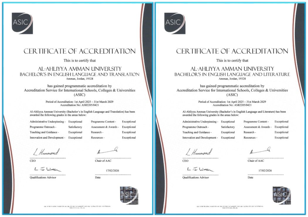 حققت كلية الآداب والعلوم - قسم اللغة الانجليزية في جامعة عمان الأهلية إنجازاً أكاديمياً رفيعاً بحصول برنامجي بكالوريوس اللغة الإنجليزية وآدابها واللغة الإنجليزية والترجمة على الاعتماد البريطاني ASIC وفق أعلى مستوى ضمن فئة التميّز " المستوى الاستثنائي".
