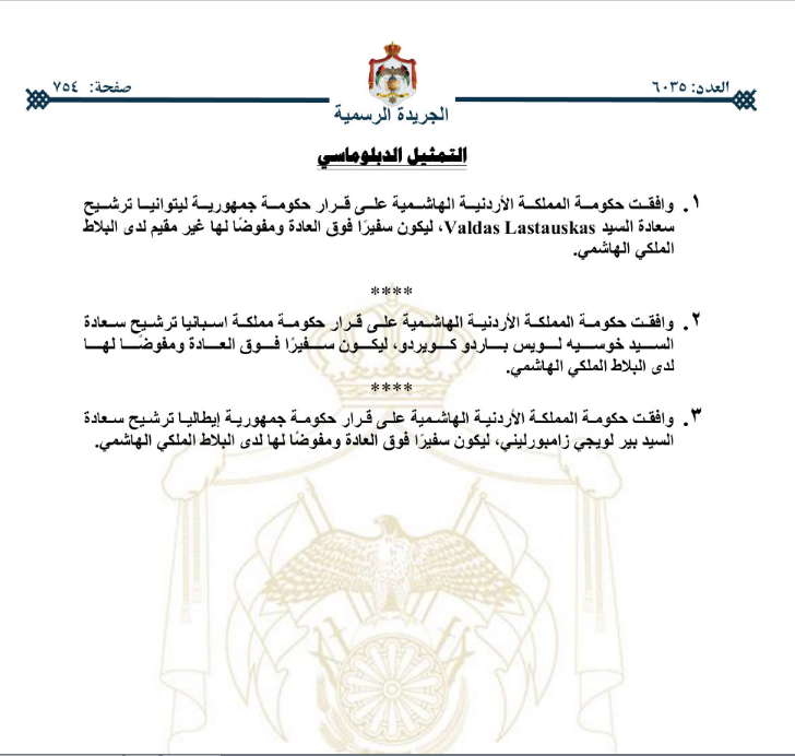صدر في عدد الجريدة الرسمية اليوم الخميس، موافقة حكومة المملكة الأردنية الهاشمية على عدد من السفراء.