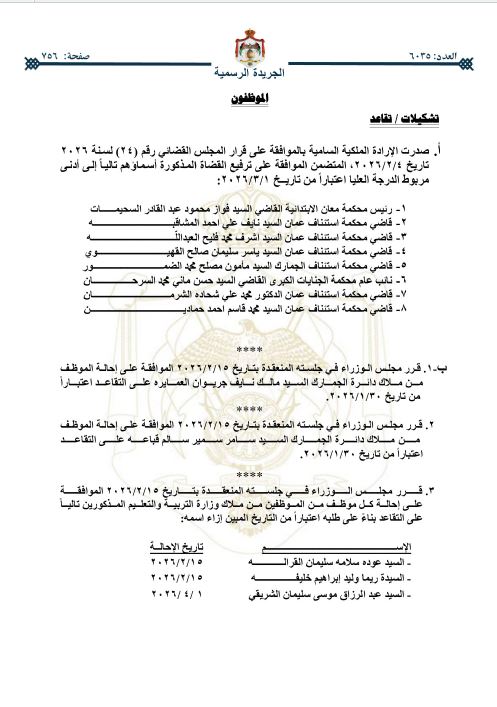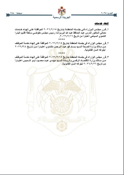 كما وقرر مجلس الوزراء إحالة وترفيع عدد من موظفي الاقتصاد الرقمي والصحة وإقليم البترا التنموي السياحي والخارجية التربية والتعليم ودائرة الجمارك.