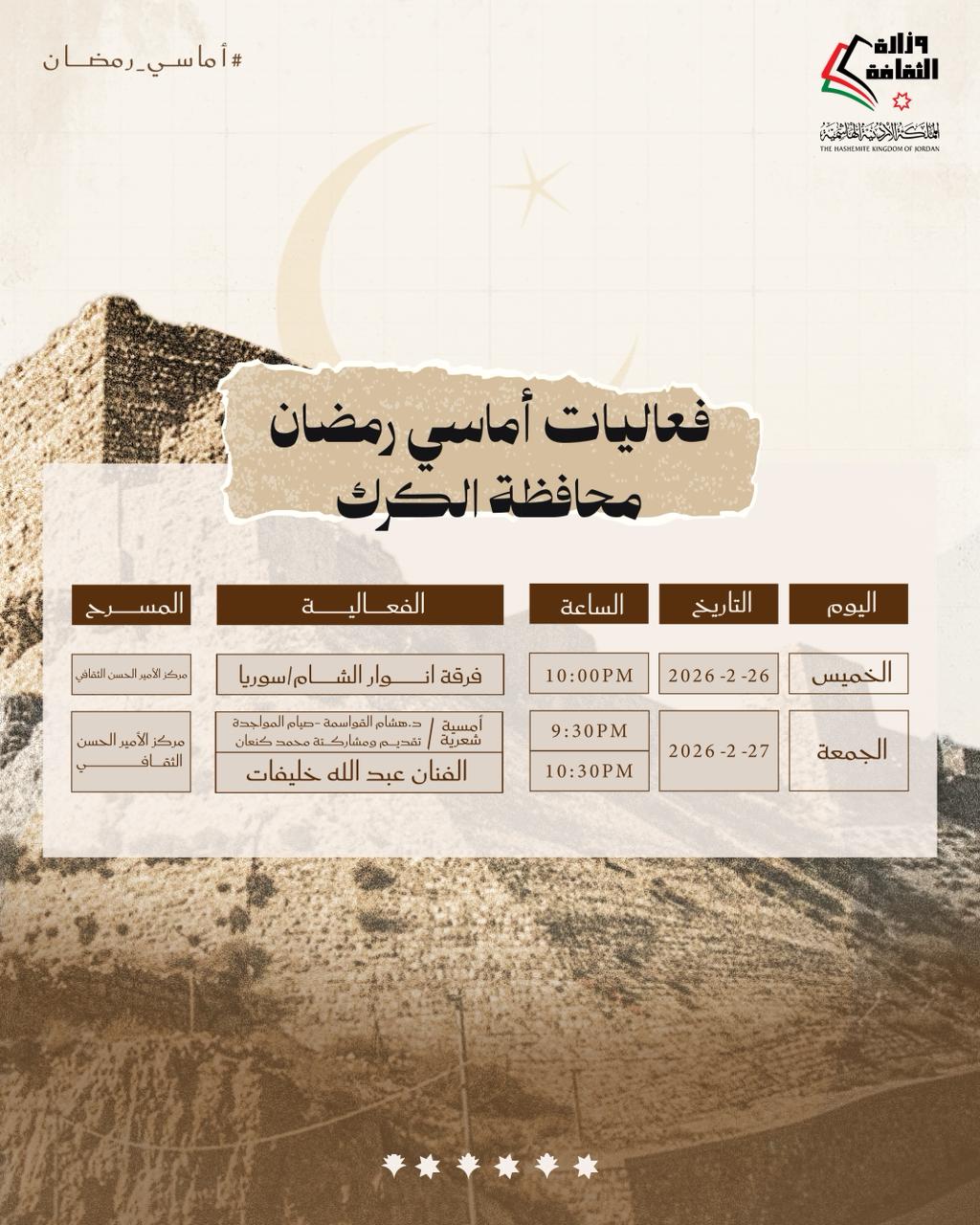 ويأتي البرنامج ضمن توجه الوزارة إلى توزيع الفعاليات الثقافية على مختلف المحافظات، بما يتيح للجمهور المشاركة في أنشطة رمضانية تعزز حضور الثقافة في الحياة العامة.