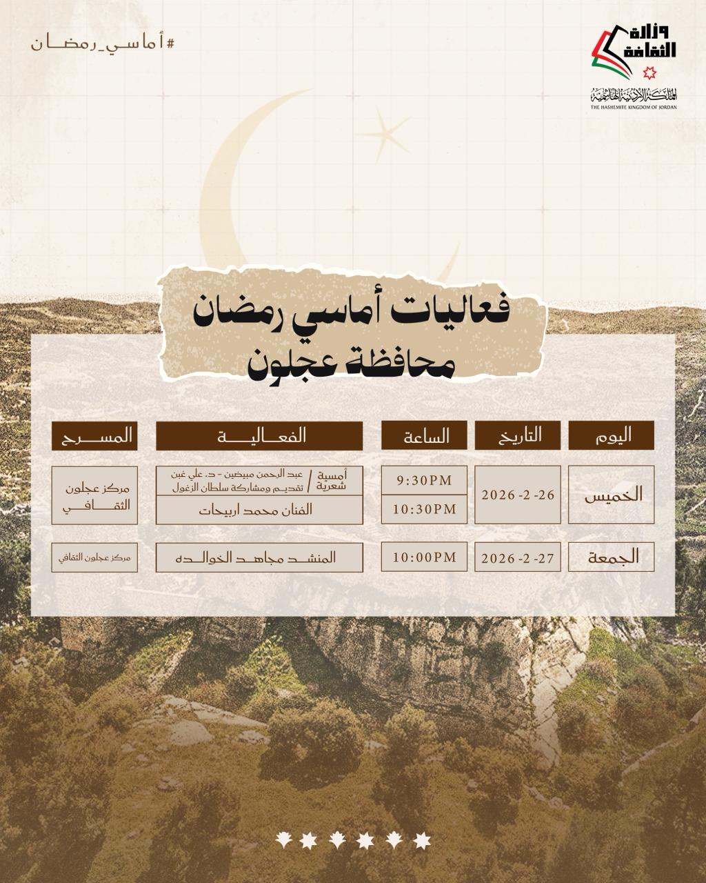 وقال وزير الثقافة مصطفى الرواشدة إن البرنامج يتضمن فعاليات متنوعة تراعي التعدد الثقافي وتعمل على ترسيخ القيم الإيجابية خلال أيام الشهر الفضيل، مشيرًا إلى مشاركة فرق إنشاد ديني ومنشدين أردنيين وعرب.