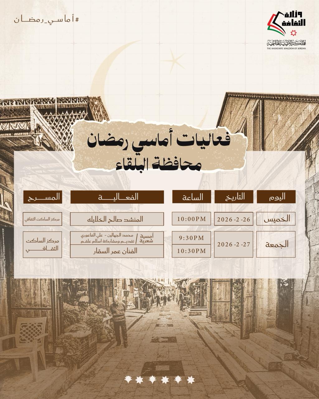 في محافظة البلقاء، تقام في مركز موسى الساكت الثقافي، يوم الخميس، الساعة العاشرة مساءً، أمسية فنية للمنشد صالح الخلايلة.