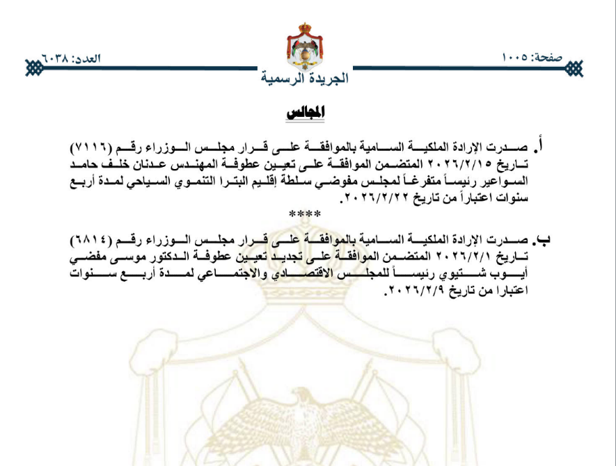 صدرت الإرادة الملكية السامية في عدد الجريدة الرسمية اليوم الخميس، بالموافقة على قرار مجلس الوزراء المتضمن تعيين المهندس عدنان السواعير رئيسًا متفرغًا لمجلس مفوضي سلطة إقليم البترا التنموي السياحي لمدة أربع سنوات.