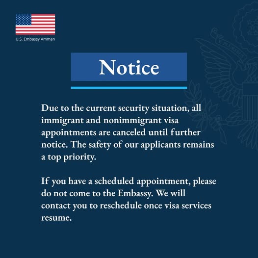 أعلنت السفارة الأميركية في عمان عن إلغاء جميع مواعيد تأشيرات الهجرة وغير الهجرة حتى إشعار آخر، بسبب الأوضاع في المنطقة.