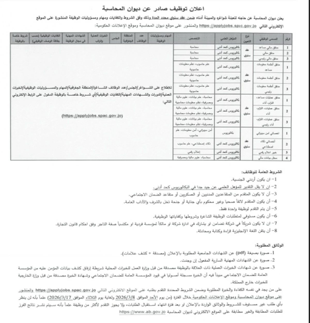 يعلن ديوان المحاسبة عن حاجته لتعبئة شواغره والمبينة أدناه ضمن عقد سنوي محدد المدة وذلك وفق الشروط والكفايات ومهام ومسؤوليات الوظيفة المنشورة على الموقع الالكتروني والمنشور على موقع ديوان المحاسبة وموقع الإعلانات الحكومية: