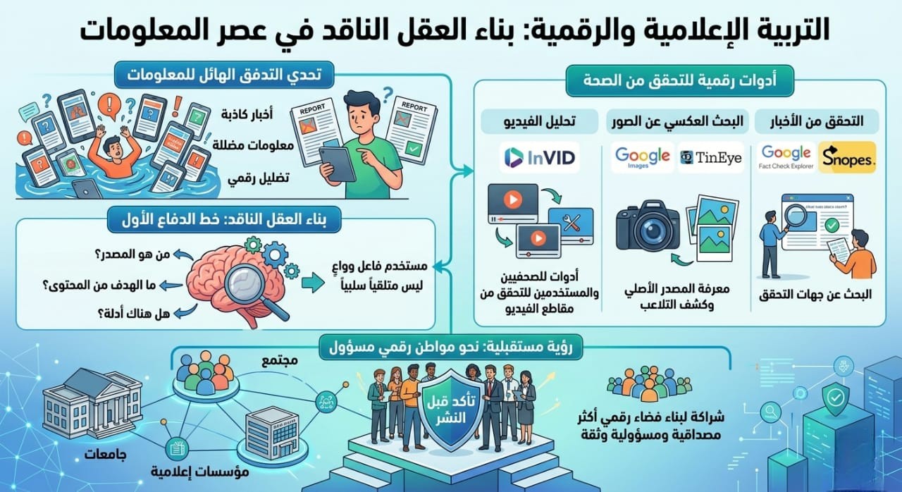 وعلى صعيدٍ موازِ، شدد أستاذ الإعلام الرقمي الدكتور صدام المشاقبة على أنَّ التدفق الهائل للمعلومات عبر الإنترنت ومنصات التواصل الاجتماعي جعل من الصعب على المستخدمين التمييز بين المعلومات الدقيقة وتلك المضللة، مؤكداً أن تنمية التفكير النقدي والقدرة على التحقق من صحة المعلومات أصبحت اليوم مهارة أساسية لكل مستخدم في البيئة الرقمية.