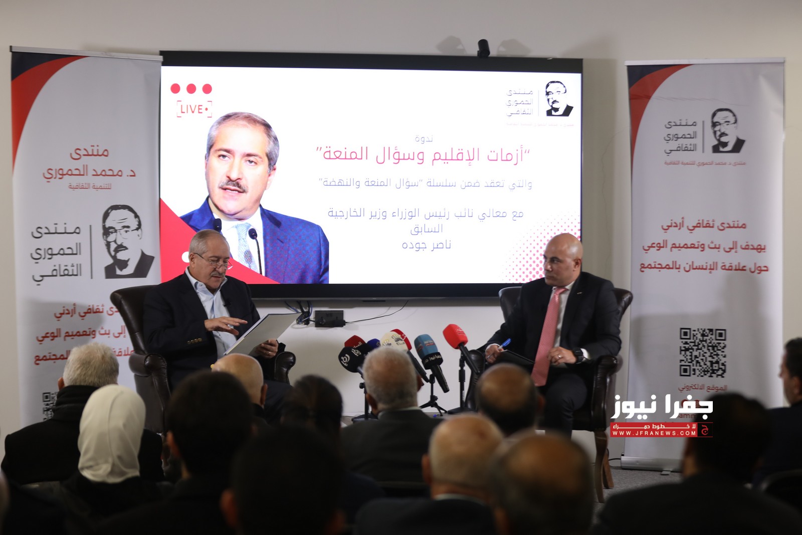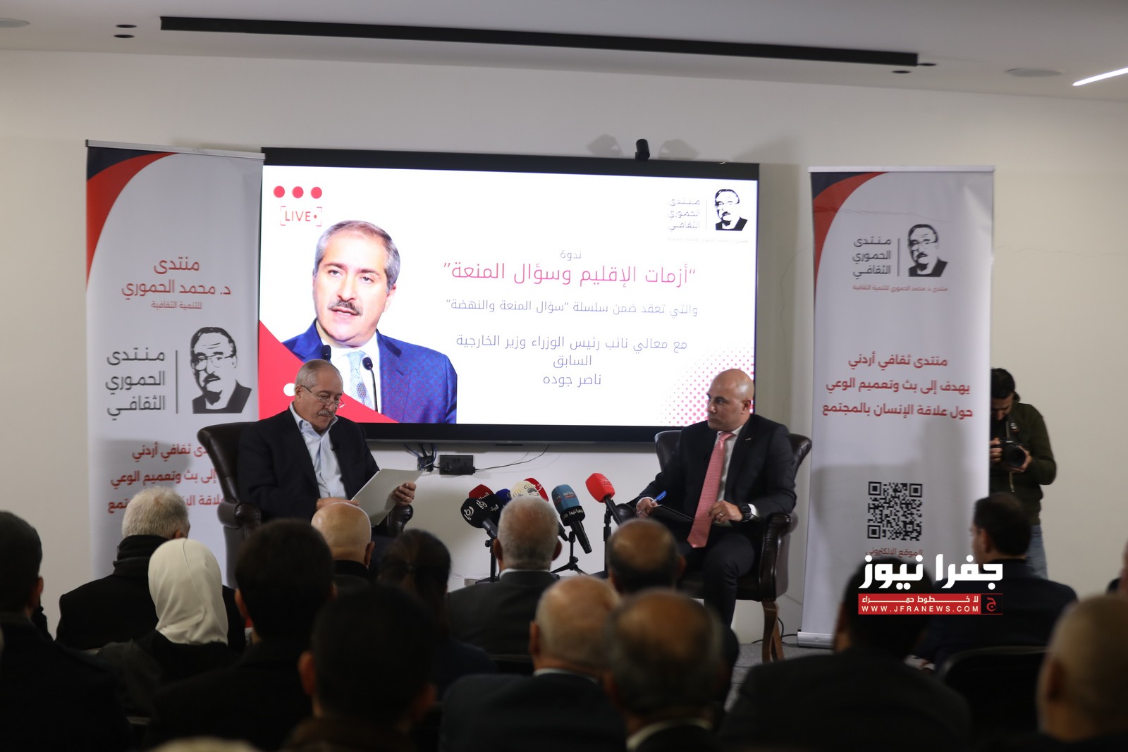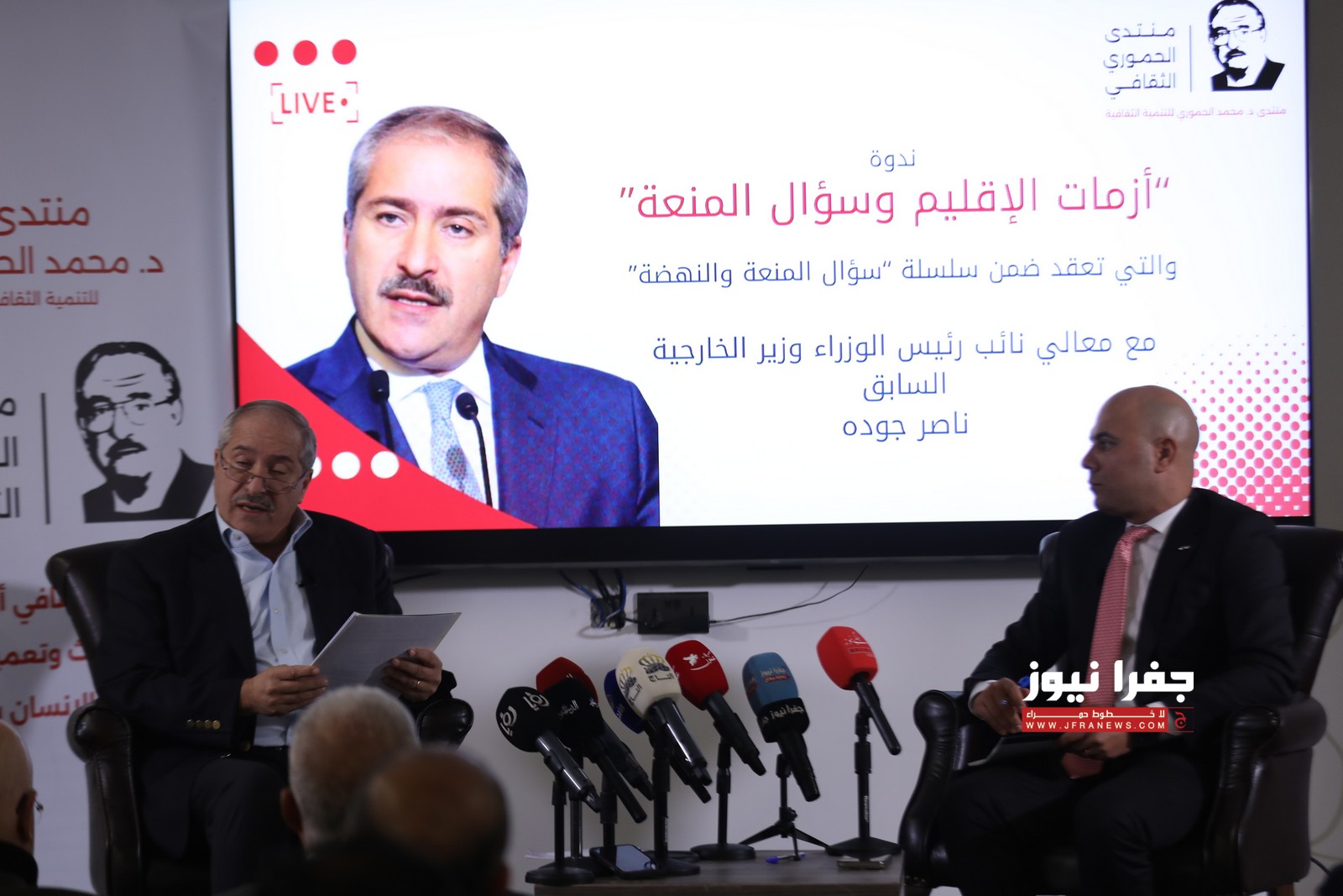 عقد منتدى محمد الحموري للتنمية الثقافية جلسة حوارية استضاف خلالها وزير الخارجية الأسبق ناصر جودة، وذلك ضمن سلسلة جلسات "سؤال المنعة والنهضة”.
