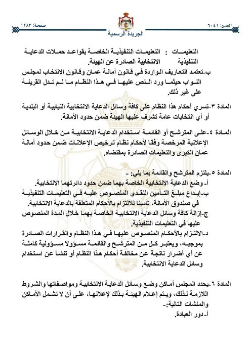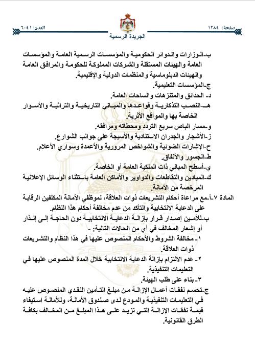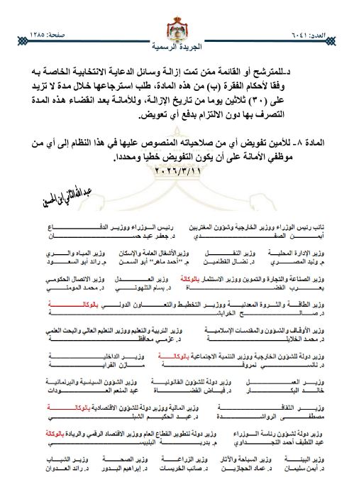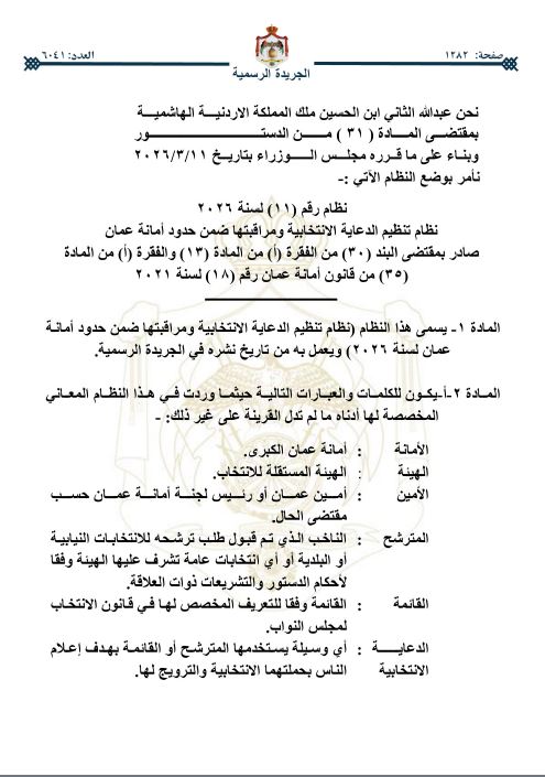 صدرت الإرادة الملكية السامية، في عدد الجريدة الرسمية اليوم الخميس بالموافقة على قرار مجلس الوزراء الصادر بتاريخ 11-3-2026، المتضمن وضع نظام تنظيم الدعاية الانتخابية، ومراقبتها ضمن حدود أمانة عمَّان.