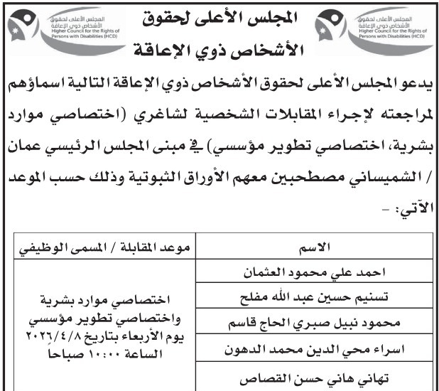 كما دعت المجلس الاعلى لحقوق الأشخاص ذوي الإعاقة، اليوم الخميس التالية أسماؤهم لإجراء المقابلات الشخصية.
