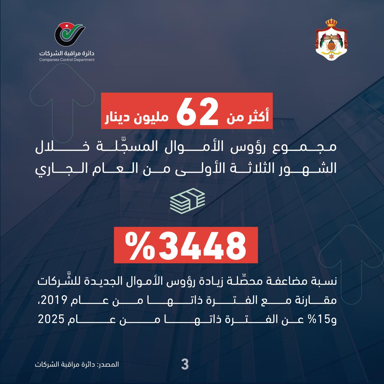 وبلغ مجموع رؤوس الأموال المسجَّلة خلال الشهور الثلاثة الأولى من العام الجاري أكثر من 62 مليون دينار، حيث كانت أعلى أنواع الشَّركات تسجيلاً، من حيث العدد خلال هذه الفترة الشَّركات ذات المسؤوليَّة المحدودة، التي بلغ عددها 1403 شركة، وبنسبة زادت عن 76 بالمئة من الشَّركات المسجَّلة، وبرؤوس أموال مسجلة تزيد عن 26 مليون دينار.