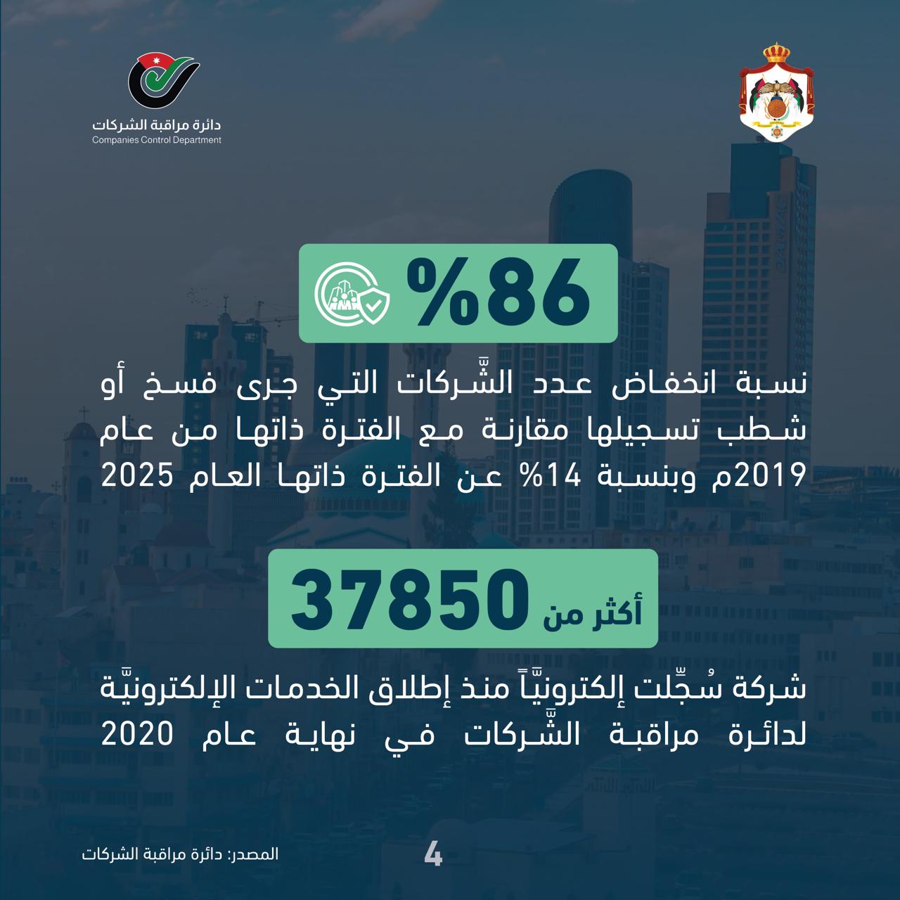 وشهدت أرقام الشَّركات خلال الفترة ذاتها أيضا انخفاضا في عدد الشَّركات التي جرى فسخ أو شطب تسجيلها بنسبة 86 بالمئة، مقارنة مع الفترة ذاتها من عام 2019، وبنسبة 14 بالمئة عن الفترة ذاتها العام 2025.