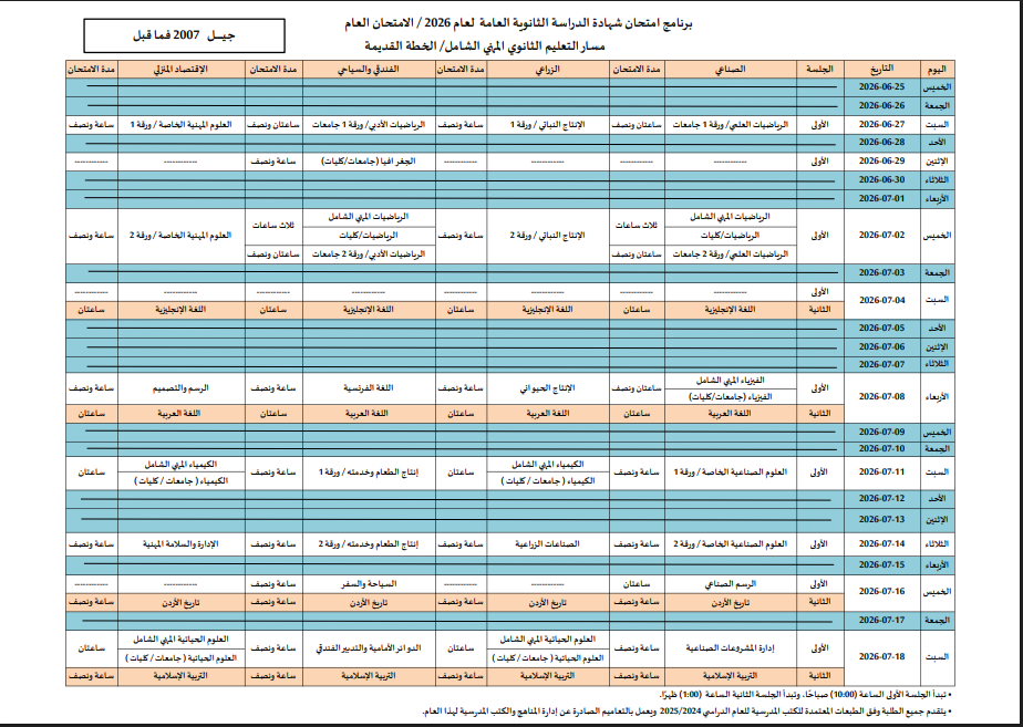 أعلنت وزارة التربية والتعليم الأحد، عن جدول امتحانات شهادة الدراسة الثانوية العامة لعام 2026 لطلبة الصف الثاني عشر.