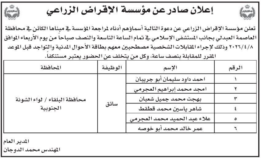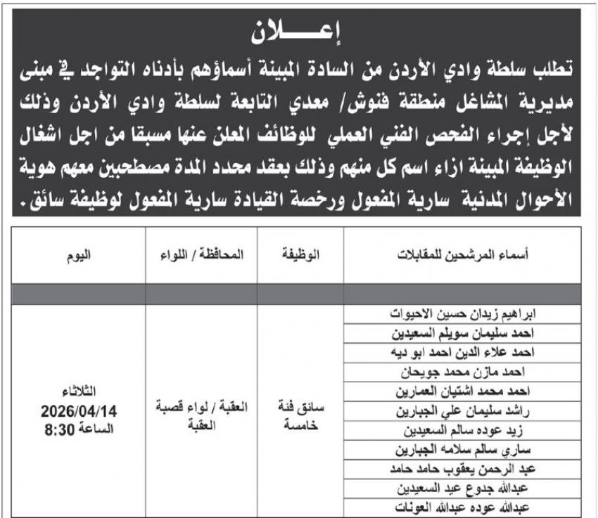أعلنت مؤسسات وشركات حكومية اليوم الاثنين عن حاجتها لتعبئة شواغر مختلفة، فيما أعلنت اخرى عن دعوة اشخاص لإجراء المقابلات الشخصية، والفحص الطبي للوظيفة.