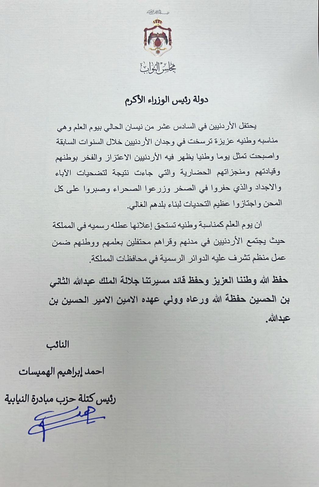 اقترح النائب أحمد هميسات في كتاب أرسله إلى رئيس الوزراء جعفر حسان، إقرار عطلة رسمية بمناسبة يوم العلم، والذي يصادف في السادس عشر من نيسان الحالي.
