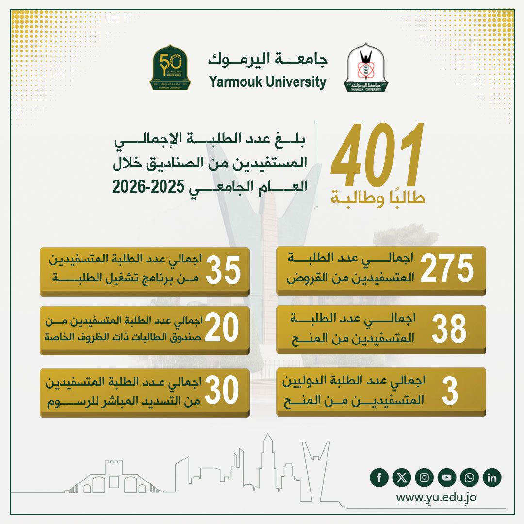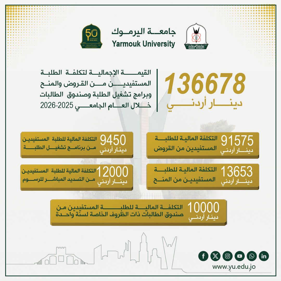 ويؤكد هذا الدعم المتنوع حرص جامعة اليرموك على تحقيق أثر مستدام لا يقتصر على الجانب المالي فحسب، بل يمتد ليشمل تمكين الطلبة وتعزيز فرص نجاحهم الأكاديمي والمهني، من خلال مزيج متكامل من المساعدات المباشرة والبرامج التشغيلية.