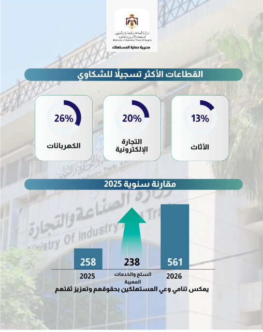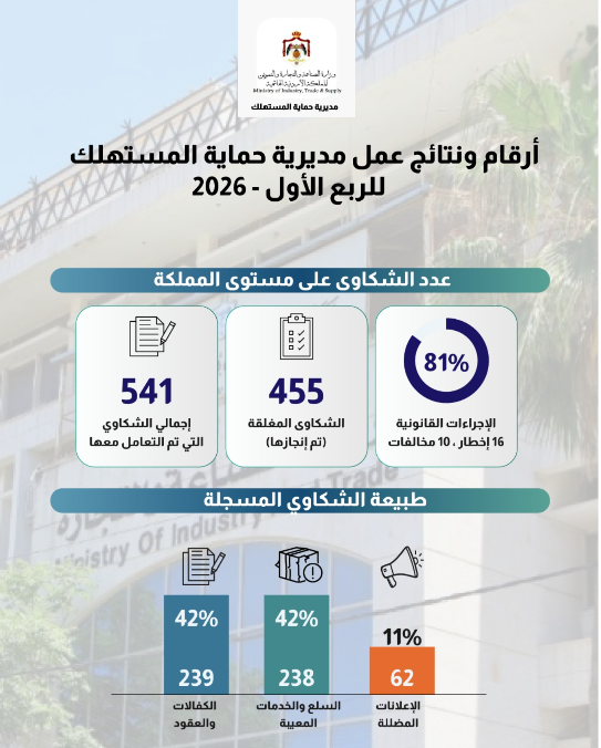 وأوضحت الوزارة في بيان، أن عدد الشكاوى المسجلة خلال الفترة ذاتها شهد ارتفاعاً مقارنة بالربع الأول من العام 2025، الذي بلغ فيه عدد الشكاوى 258 شكوى، بنسبة زيادة تُقدّر بنحو 54 بالمئة، ما يعكس تنامي وعي المستهلكين بحقوقهم وتعزيز ثقتهم بجهود الوزارة ممثلة بمديرية حماية المستهلك.
