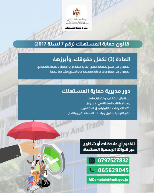 ولفتت إلى أن المادة (3) من قانون حماية المستهلك رقم (7) لسنة 2017 حدّدت حقوق المستهلك، بما في ذلك الحصول على سلع أو خدمات تحقق الغاية منها دون الإضرار بصحته أو مصالحه، والحصول على معلومات كاملة وصحيحة عن السلع أو الخدمات وشروط بيعها.