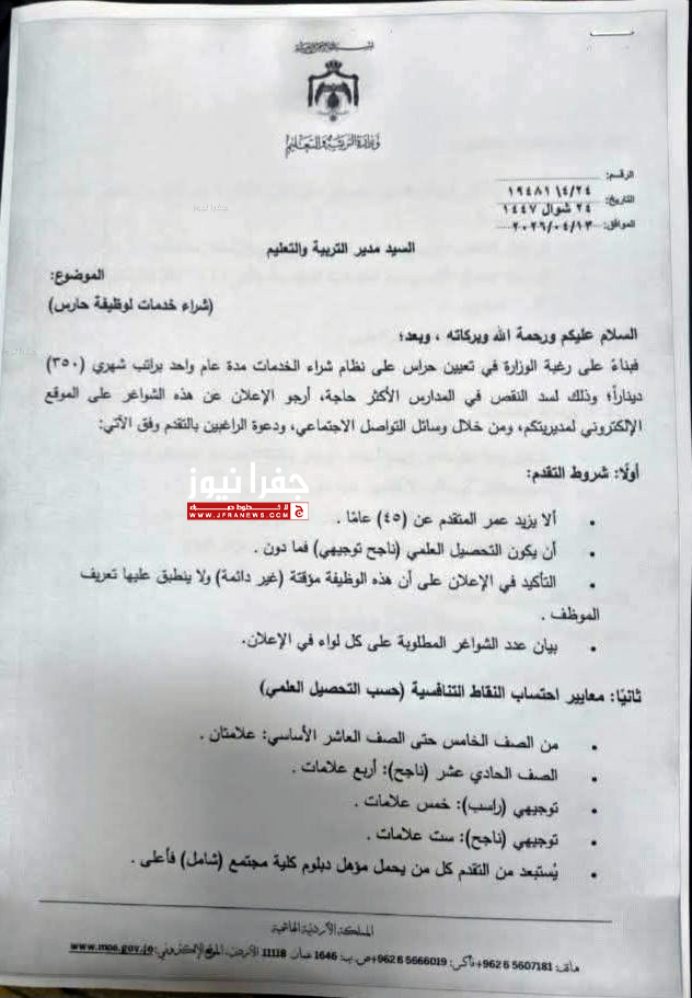 وبحسب الإعلان، تسعى الوزارة إلى التعاقد مع حراس مدارس لمدة عام واحد، وبراتب شهري يبلغ (350) دينارًا، على أن يتم نشر الشواغر عبر مديريات التربية والتعليم ومنصاتها الإلكترونية، مع تحديد عدد الفرص المتاحة في كل لواء.