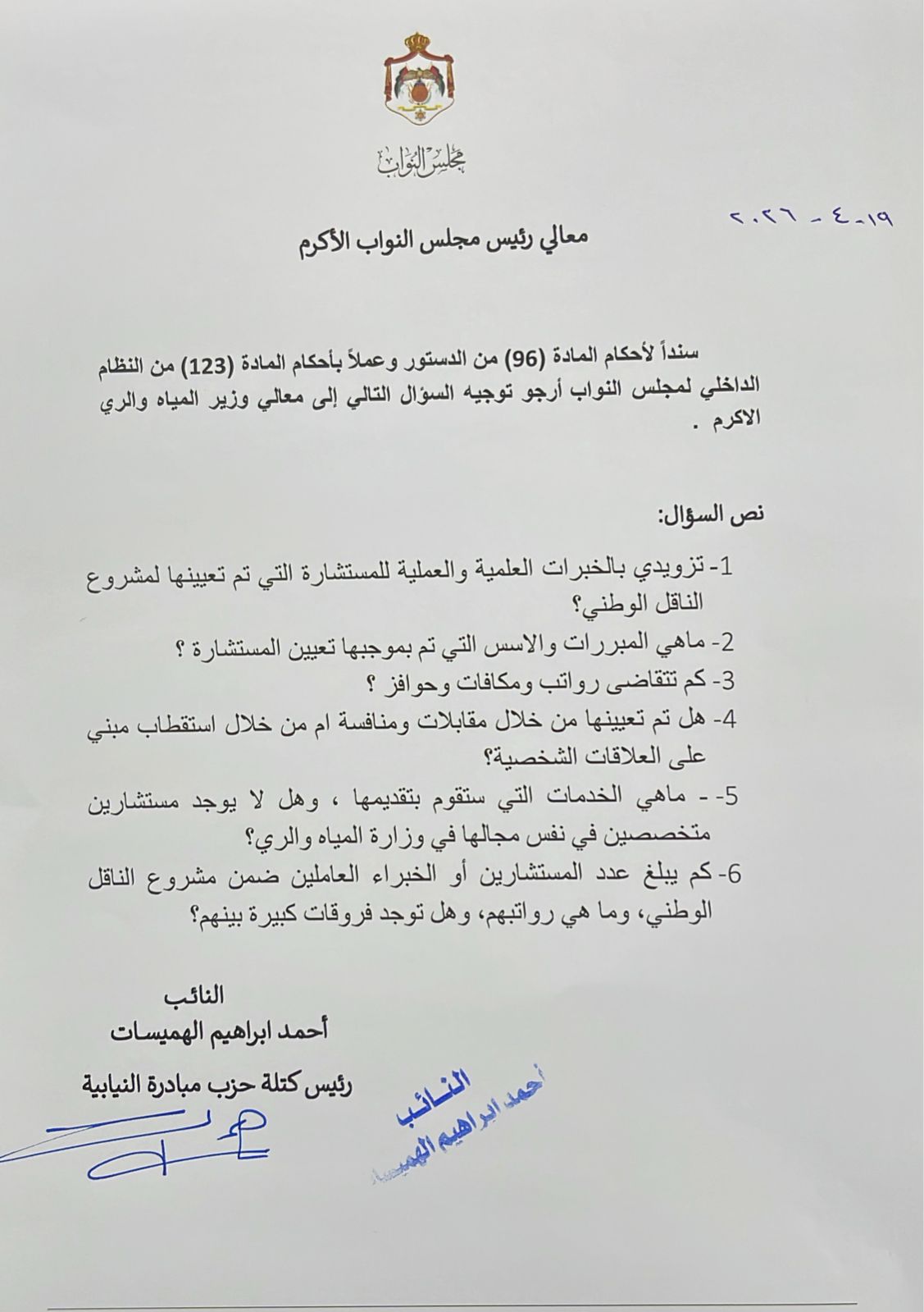 وجه النائب احمد هميسات أسئلة لوزير المياه والري، حول أسس تعيين مستشارة في مشروع الناقل الوطني.