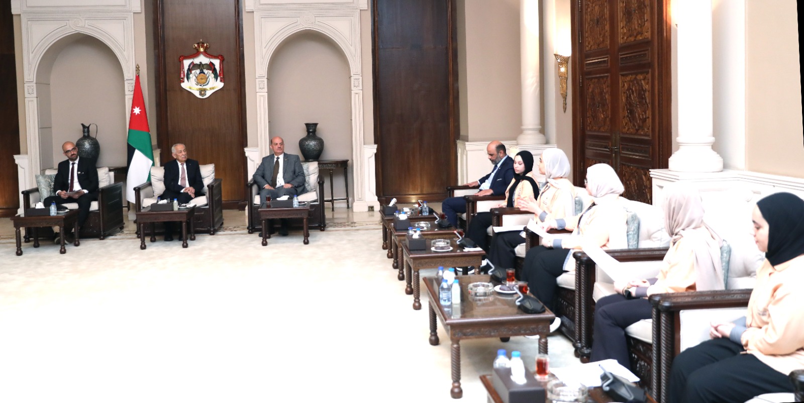 استقبل رئيس الديوان الملكي الهاشمي يوسف حسن العيسوي، اليوم الاثنين، وفداً طلابياً من مدارس السرمد، يمثل مبادرة الميثاق الوطني، ووفداً من ابناء لواء ناعور، في لقاءين منفصلين.